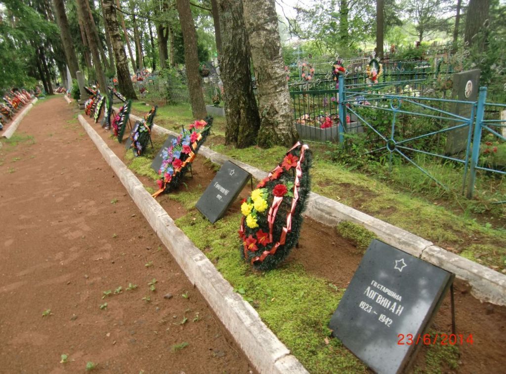 - захоронение и его местоположение;- останки усопших;- текст мемориальной надписи: \"РЯДОВОЙ ПОНОВ С.Я.1914-1942 РЯДОВОЙ СУВОРИН М.Ф.1911-1942РЯДОВОЙ ЧЕРКАС В.С.1916-1941СТ. СЕРЖАНТ ТРОФИМОВ А.М.1921-1944БОРОДИН Д.Т.1944\"