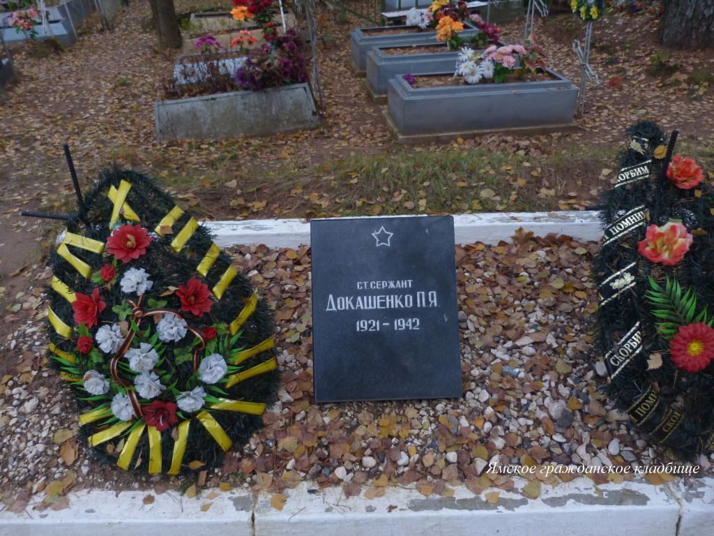 - захоронение и его местоположение;- останки усопшего;- текст мемориальной надписи: «СТ. СЕРЖАНТДОКАШЕНКО П.Я.1921-1942»