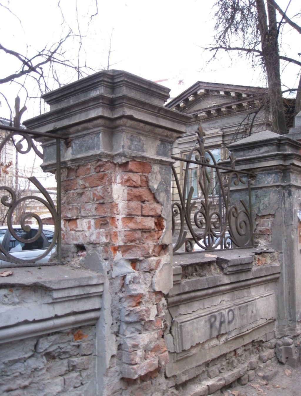 Предмет охраныобъекта культурного наследия регионального значения«Кирпичная ограда с кованой решеткой», конец XIX века – начало XX века, входящего в состав объекта культурного наследия регионального значения «Усадьба М.Н.Щелокова»,со схемами предмета охраныГрадостроительные характеристикиМестоположение ограды в структуре усадьбы М.Н. Щелокова по линии застройки улицы Студеная с примыканием к северному боковому фасаду главного дома усадьбы.Объемно-пространственные и планировочные характеристикиОбъемно-пространственное решение ограды, сложившееся на начало XX в., состоящей из двух участков ограды, образованной кирпичными столбами с заполнением в виде кованой решетки на кирпичном основании – стенках, и двух центральных парных столбов, один из которых отдельностоящий, второй примыкает к участку ограды, с главным фасадом, ориентированным на улицу Студеная.Конфигурация в плане линейная с проемами для ворот и калитки. Существующие высотные характеристики и отметки:- завершения кирпичных столбов;- верха кирпичных стенок;- верха цоколя;- верха основного объема кованой решетки;- выступающих элементов декора кованой решетки;- профилированных поясов и прямоугольных филенок.Конструктивные характеристикиКонструкции, материал, техника исполнения и обработки:- исторического фундамента - кирпичный ленточный;- столбов и стенок в исторических габаритах - красный глиняный кирпич, оштукатуренный, окрашенный; кованые подставцы центральных парных столбов для навески ворот и калитки;- заполнений ограды – кованая решетка с рисунком растительного орнамента.Композиция и архитектурно-художественное оформление фасадов Композиционное решение фасадов ограды на начало XX в.: симметричное композиционное решение и двухчастная структура продольных (западного и восточного) фасадов.Архитектурно-художественное оформление фасадов ограды в стиле эклектикиВид обработки фасадных поверхностей и декора:- столбов и стенок – оштукатуренные, окрашенные;- заполнений ограды – кованая решетка;Горизонтальные членения фасадов ограды:- широкий выступающий цоколь;- профилированные пояса;- ряд вытянутых по горизонтали прямоугольных филенок, профилированных по периметру;- ряд симметричных кованых решеток с рисунком растительного орнамента (с утратами элементов);Вертикальные членения фасадов ограды: - центральные парные столбы с трехчастным делением по вертикали и поперечным сечением в виде квадрата с усеченными углами (90 градусов); - столбы ограды (5 штук) с остроконечными завершениями-башенками, с трехчастным делением по вертикали и поперечным сечением в виде квадрата с усеченными углами (90 градусов) наподобие ризалитов со стороны главного западного фасада;- заполнения между столбами - кирпичные стенки с кованой решеткой сверху.Схемы размещения элементов предмета охраны:1. План. 2. Западный фасад.4. Восточный фасад. Южный фасад.