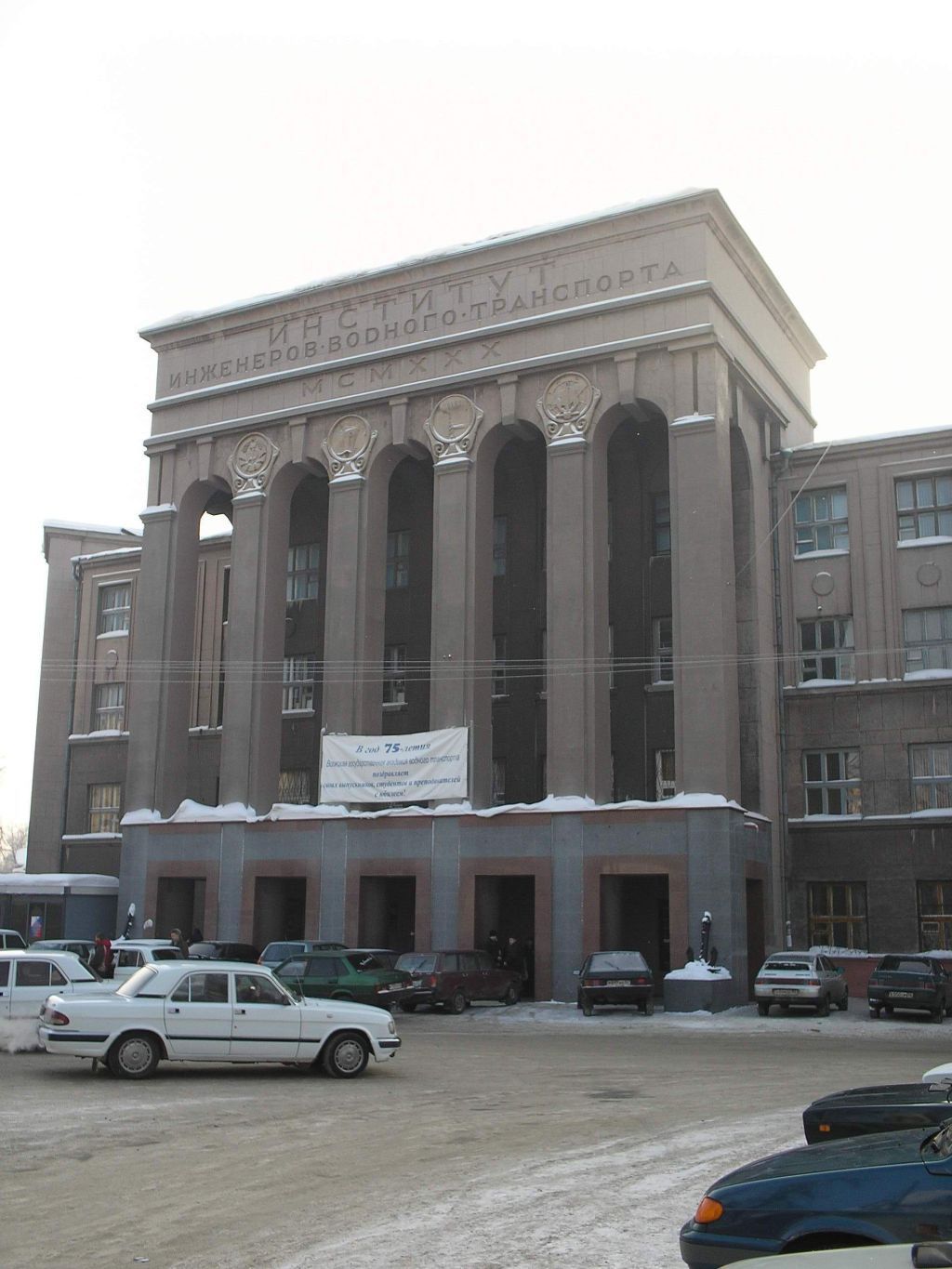 Градостроительные характеристикиАкцентное местоположение портика, примыкающего к учебному корпусу Института инженеров водного транспорта, обращенного главным фасадом в сторону перекрестка ул. Минина и ул. Пискунова.Объемно‐пространственные и планировочные характеристики Объемно-пространственная композиция прямоугольного в плане шестиколонного портика, включающая двухъярусную высокую аркаду с завершением в виде антаблемента (парапетной стенки с венчающим карнизом и фризом).Конфигурация, габариты в плане, высотные отметки крыши, венчающего карниза, арок и тяг портика.Конструктивные характеристики Конструктивная система: несущие наружные колонны портика; перекрытие первого яруса, выполненное по балкам, перекрытие второго яруса в виде разреженного настила по монолитным железобетонным аркам.Высотные отметки и материал перекрытий.Конфигурация, габариты, уклон, высотные отметки, односкатной кровли с фальцевым покрытием.Материал и техника исполнения колонн портика. Композиционное и архитектурно‐художественное оформление Декоративное оформление портика: прямоугольные арочные проемы первого яруса, конфигурация и габариты; полуциркульные арочные проемы с замковыми камнями колоннады второго яруса, конфигурация, габариты; рустованная поверхность второго яруса аркады; пилястры, расположенные на колоннах прямоугольного сечения; профилированные капители; замковые камни арок портика; четыре круглых эмблемы-картуши с барельефами (советской символики труда и водного транспорта), расположенные в завершении пилястр, между арками; парапетная стенка в виде антаблемента портика; контррельефные надписи на фризе аттика «ИНСТИТУТ ИНЖЕНЕРОВ ВОДНОГО ТРАНСПОРТА» и «МСМХХХ»; венчающий профилированный карниз, профилированные пояса фриза антаблемента; фонари граненой формы по осям арочных проемов портика в уровне второго яруса (утрачены, подлежат воссозданию)Материал и характер отделки фасадных поверхностей: отделка верхнего яруса (в уровне со второго по четвертый этажи здания) портика фактурной декоративной штукатуркой с окраской, оштукатуренная внутренняя поверхность первого яруса. Архитектурно‐художественное оформление внутреннего объема портика:- балки первого яруса, оформленные потолочными профилированными тягами; - перекрытия второго яруса (потолок) с имитацией кессонов рейкой.