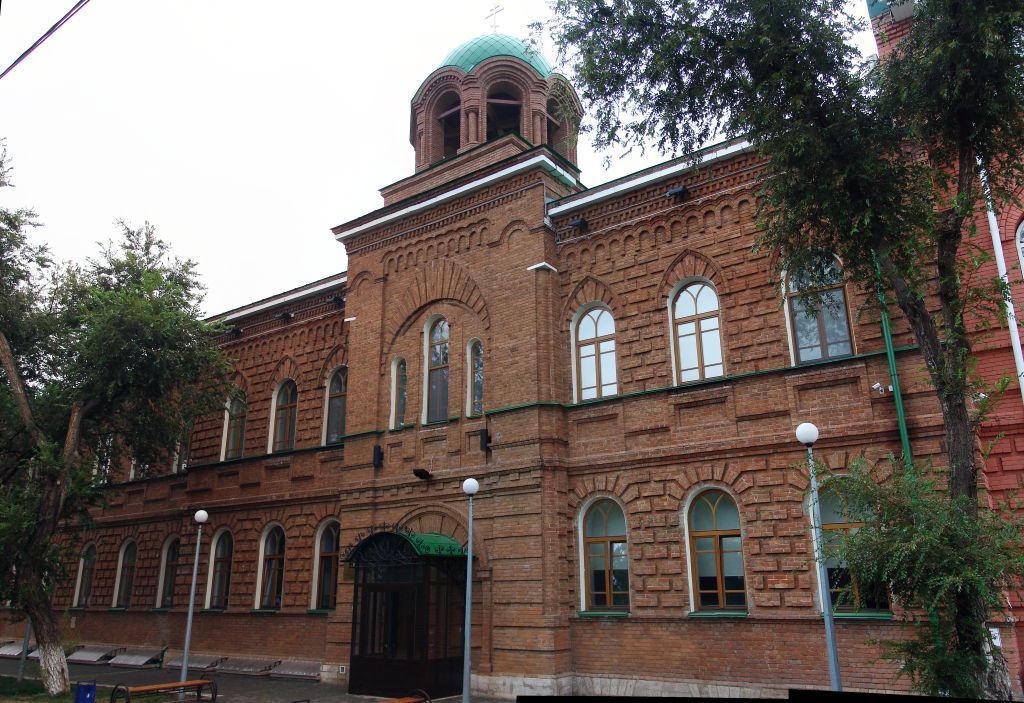 1. Особая градостроительная роль здания: Участвует в формировании квартала между пер. Брыкина (бывший пер. Тюремный) и пер. Казарменным, исторически важной территории.2. Объемная композиция здания: Прямоугольное, двухэтажное здание с пристроем с северной стороны, образующим дополнительный корпус, с входными группами с северной и южной сторон.3. Архитектурно-художественное оформление фасадов здания: Фасад сложен из губернского кирпича, фламандской перевязкой. Угловые элементы – из фасонного кирпича в виде пилястр. Главный фасад выполнен с применением техник художественной кладки. Второй ярус здания сопровожден блочной рустовкой; первый ярус рустован с каймой. В подкарнизной части применен повторяющийся геометрический орнамент из прямоугольных блоков. Ярусы здания разделены пояском. На уровне второго яруса под каждым из оконных проемов главного фасада исполнена вогнутая прямоугольная ниша. Оконные проемы главного фасада имеют разные формы сандриков в зависимости от яруса здания. На верхнем ярусе в виде ланцевидной арки, придавая оконному проему мотив килевидного, на первом ярусе – флорентийской аркой. В центральной части здания надстройка для колокольни с зонтичным куполом и сквозными полуциркульными проемами. На крыше выполнен тонкий металлический парапет. Со стороны торцевого и дворового фасада, выступающих декорирующих элементов нет. Со стороны дворового фасада имеется стеклянный пристрой не относящийся к изначальному внешнему облику исторического здания.4. Материал и характер отделки фасадных поверхностей здания: Кирпич.5. Местоположение, габариты, конфигурация и оформление дверных и оконных проемов здания: Двери-филенчатые, распашные двухполотные с остекленными вставками. При входной группе и в арочных проемах над дверьми установлено веерообразное окно, в портальное проемах- французское окно. Проемы, двери, рамы оконных проемов тонированы белой краской. Полуциркульные арочные оконные проемы на всех ярусах здания. С главного фасада украшены сандриками в виде ланцетной флорентийской арки.6. Архитектурно-декоративное оформление интерьеров здания: Внутренние декоративные элементы: штукатурная отделка интерьеров, лепные потолочные карнизы, колонны тосканского ордера с классическим карнизом.7. Материалы и конструкции здания: Кирпичные стены, стропильные конструкции под куполом, вальмовая крыша, колонны, несущие конструкции.8. Стилистические особенности и историческая функция здания: Образец применения кирпичного стиля в строительстве православных зданий в городе Оренбурге, возведенного в середине 19 века и восстановленного в начале 20 века, представляющий историко-культурную ценность.