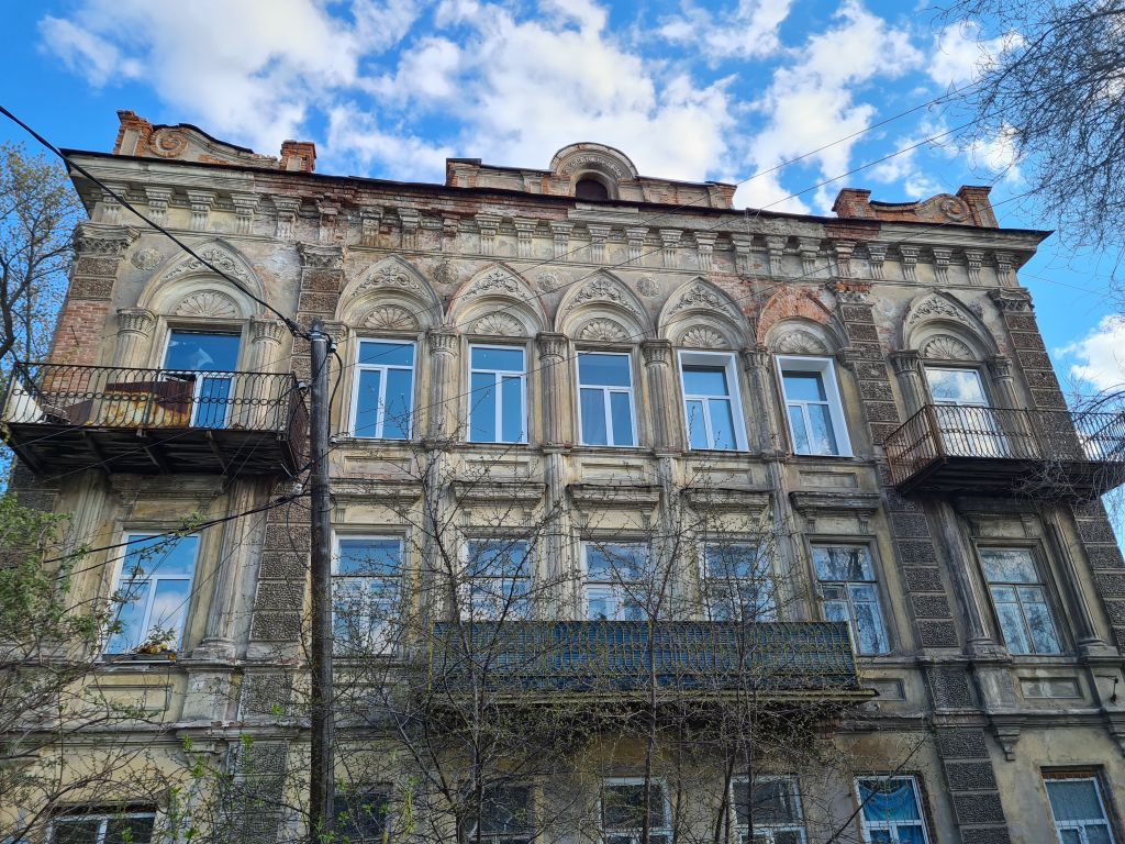 1. Объемно-пространственное решение территории: Местоположение границ территории (см. схему); местоположение объекта в историческом домовладении: лицевым фасадом вдоль северной границы домовладения, торцевым фасадом вдоль всей западной границы, южным фасадом южного крыла вдоль южной границы домовладения; ограждение от южного крыла по периметру участка, въездные ворота и калитка со стороны пер. Бухарского; культурный слой глубиной 1,5 м.2. Объемно-планировочное решение: Г-образная конфигурация в плане, где основной объём прямоугольный в плане, с пристроенным позднее южным крылом; исторические габариты здания; спуск в подвальный этаж вдоль западного фасада основного объёма, его габариты и отметки крыши; приямки окон подвального этажа; решение западного фасада южного крыла брандмауэрной стеной с подвышением третьего этажа над лестничной клеткой; внутренняя секционная планировка, составленная несущими стенами за исключением поздних перегородок; расположение, форма, габариты и отметки исторических проёмов, подоконных и венчающего карнизов; количество оконных проёмов (7 по лицевому фасаду); вальмовая крыша сложной конфигурации, отметки конька крыши; исторические отметки перекрытий и лестничных площадок; расположение и конфигурация лестниц; каменное ограждение двора.3. Конструктивное решение: Исторические конструкции: наружные и внутренние капитальные кирпичные стены; фундаменты и белокаменный цоколь основного объёма, кирпичный цоколь южного крыла; клинчатые белокаменные перемычки окон подвального этажа; исторические наружные и внутренние кирпичные стены из глиняного обожжённого кирпича на известковом растворе; клинчатые перемычки оконных проёмов основного объёма, лучковая перемычка ворот южного фасада основного объёма; лучковые перемычки проёмов южного крыла; кирпичные кронштейны и основания карнизов с применением лекального кирпича; белокаменные плиты в углах венчающего карниза; кованые ухваты водосточных труб; вальмовая крыша, стропильная система, покрытие кровельным листовым железом; система наружного организованного водостока; подоконные отливы, покрытия аттиков кровельным листовым железом; штукатурная отделка фасадов основного объёма; балконы лицевого фасада по металлическим балкам; кованое ограждение балконов; кованные въездные во двор ворота и калитка с металлическими столбами; деревянные оконные и дверные блоки; своды Монье в перекрытиях лестничных клеток; внутренние лестницы: бетонные ступени с астрагалом по тетиве, литые балясины ограждения, деревянный поручень; деревянные подоконные доски.4. Архитектурно-художественное решение фасадов основного объема: Архитектурно-художественное решение в эклектичном стиле архитектуры: сочетание ордерной системы с барочным богатством декора и мусульманскими мотивами: 1. Композиционная структура фасадов: трёхчастная структура лицевого (северного) фасада; симметрия относительно центральной оси; ритм проёмов, простенков, декоративных элементов; горизонтальные членения (цоколь, междуэтажный карниз первого этажа, подоконные карнизы второго и третьего этажей, фриз и венчающий карниз, балконы); вертикальные членения (простенки, пилястры, стрельчатые архивольты проёмов третьего этажа, аттики). 2. Декоративное оформление фасадов: белокаменный цоколь, с з
