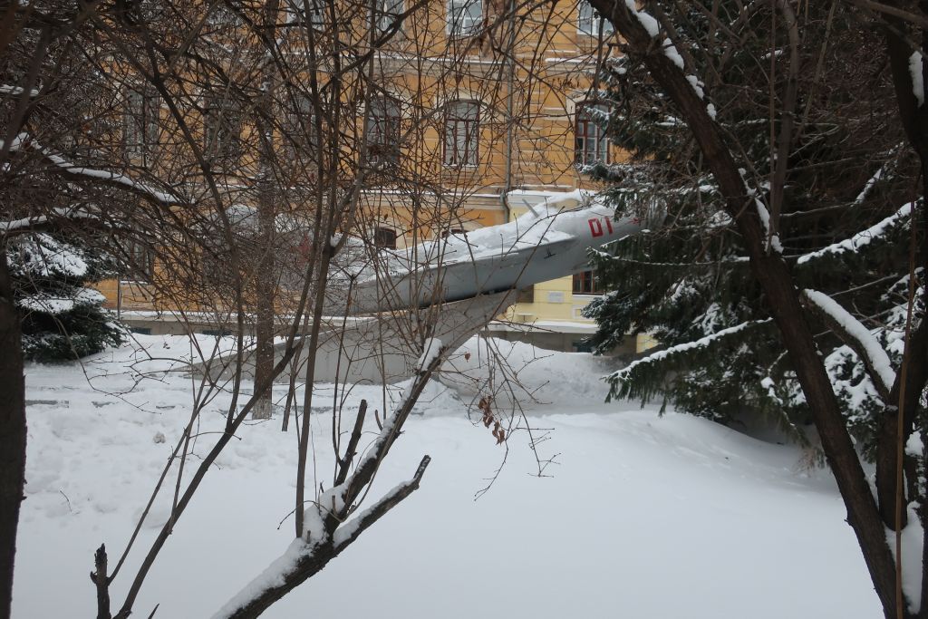 Установленный на пьедестале самолет, на котором в годы учебы в оренбургском высшем авиационном училище летал первый в мире летчик-космонавт Гагарин Юрий Алексеевич