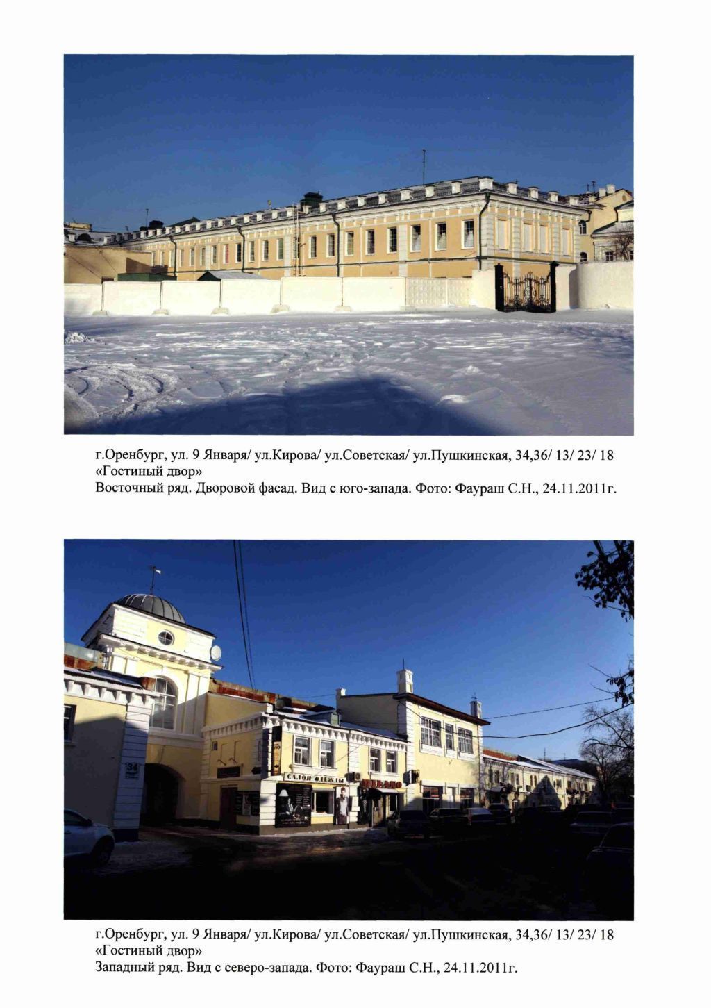 1Объемно-пространственное решение территории:Местоположение границ территории и объекта на ней.2Объемно-планировочное решение:Историческое объемно-планировочное решение: кирпичное двухэтажное здание; прямоугольная конфигурация уличной и дворовой линии, составленная двумя различными объемами, соединенными в уровне второго этажа надвратной башней (колокольней) под куполом; секционная с обособленными лавками композиционная схема дворовой линии; секционная с анфиладными проемами композиционная схема уличной части; подвалы под высокими за счет повышенного первого этажа, объемами уличной части; габариты в плане 192,8 м × 14,18 м (часть здания утрачена); надвратная башня с куполом и шпилем и вальмовой кровлей.3Конструктивное решение:Строительные конструкции: стены из глиняного обожженного кирпича размерами 260(265) × 125(130) × 70 миллиметров; сводчатое перекрытие помещений подвала и дворовой линии первого этажа, а именно: перекрытие в лавках дворовой линии – коробовые своды; перекрытия в помещении юго-западного угла – лотковые своды; подвал со сводами Монье; пол подвала кирпичный «елочкой», ложком вверх; конструктивное решение кровли уличной линии – фальцевая, металлическая, односкатная.4Архитектурно-художественное решение уличных фасадов:Архитектурно-художественное решение: оштукатуренная фактура стен; муфтированные лопатки уличной линии; муфтированные лопатки первого этажа и плоские пилястры второго этажа северного высокого объема уличной линии; плоские с энтазисом пилястры второго яруса башни; рустованные лопатки углов третьего яруса башни; широкие арочные проемы первого этажа; прямоугольные проемы высоких объемов уличной линии; металлические ставни проемов первого этажа; простые междуэтажные карнизы уличной линии; раскрепованное подоконье второго этажа уличной линии, завершающееся выкружкой;подоконные карнизы второго этажа уличной линии; лучковые окна второго этажа уличной линии; полуциркульные окна второго яруса башни с ленточным наличником, с замком и пятами;профилированные обрамления окон второго этажа уличной линии; круглые окна третьего яруса башни; прерывающие ленточные наличники южного высокого объема уличной линии;лепные наличники второго этажа северного высокого объема уличной линии; антаблемент с кронштейнами, профилированными каблуком и модульонами по фризу; филенчатые парапетные столбики высокого южного объема.5Архитектурно-художественное решение дворовых фасадов:Стены отштукатурены и окрашены; декоративных элементов нет.6Декоративно-художественная отделка интерьеров:Пол подвала кирпичный «елочкой», ложком вверх.