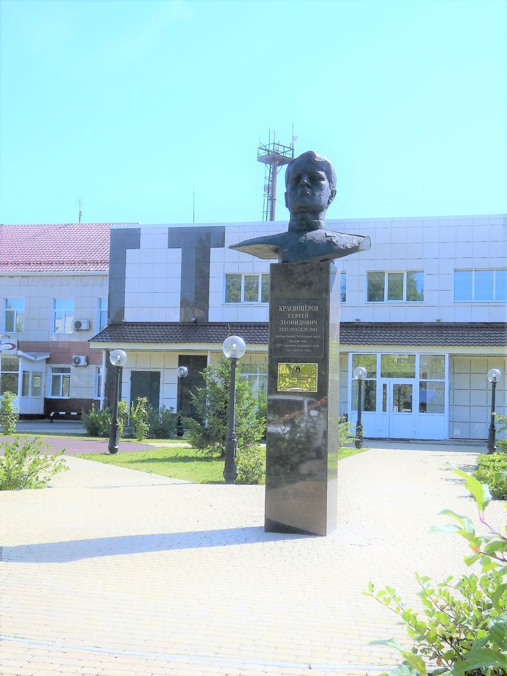 1 Расположение в центральной части города с отступом от линии застройки четной стороны ул. Ленина и организацией пространства (сквера)2 Бассейн визуального восприятия с ул. Ленина с удалением до 30 м3 Оплечный бюст Героя Советского Союза С.Л. Красноперова из кованой меди работы скульптора А.А. Уральского4 Круглый железобетонный постамент высотой 3,5 м с кольцом из кованой меди с надписью «Военный летчик С.Л. Красноперов»