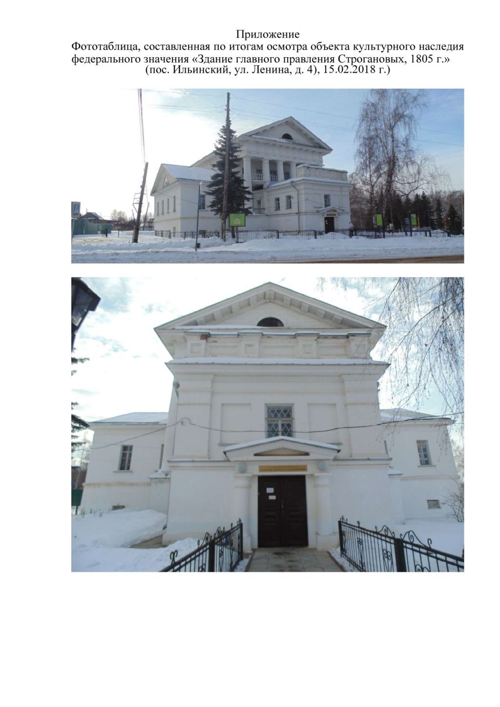 1. Градостроительные характеристики1.1 Расположение на пересечении улиц Ленина и 50 лет Октября в центре п. Ильинский в западной части площади перед Пророко-Ильинской церковью, с организацией прилегающего пространства1.2 Бассейн визуального восприятия ограничен линией застройки западного берега пруда, ул. Сюзева, Оборонная, Теплоухова1.3 Система визуального восприятия с прилегающих открытых пространств – силуэт, фасады2. Архитектурные особенности (экстерьер)2.1 Объемно-пространственное решение – прямоугольное в плане двухэтажное здание с мезонином над центральной частью, с ризалитами на северном и южном фасадах2.2 Материал стен – полнотелый керамический кирпич2.3 Материал фасадной поверхности – известковая штукатурка, побелка2.4 Крыша скатная, кровля металлическая фальцевая с организованным водостоком.2.5 Декоративное оформление фасадов в стилистике архитектуры классицизма2.5.1 - шестиколонные портики на стилобате цокольного этажа на южном и северном фасадах, балконы в уровне 2-го этажа и мезонина с точеными балясинами и деревянными перилами2.5.2 - треугольные фронтоны с полуциркульными слуховыми окнами в обрамлении веерного наличника с замком над восточным и западным фасадом, венчающий карниз2.5.3 - венчающий карниз с метопами и триглифами2.5.4 - междуэтажный профилированный карниз2.5.5 - входная пристройка на северном фасаде: кирпичный аттик, фланкирующие пилястры2.5.6 - вход в обрамлении двухколонного портика2.6 Расположение, габариты дверных проемов, в том числе не используемых2.7 Расположение, габариты, историческая расстекловка оконных проемов, в том числе не используемых; подоконные карнизы. Материал двойных створных с глухой фрамугой рам – дерево с остеклением.3. Архитектурные особенности (интерьер)3.1 Планировочное решение – расположение капитальных стен, лестниц, проемов, их габариты и конфигурация3.2 Сводчатые перекрытия 1-го (цокольного) этажа3.3 Сводчатое перекрытие и кирпичный паркет в помещении № 9 второго этажа3.4 Центральная лестница с деревянными ступенями, точеными балясинами, деревянными перилами3.5 Лестница в мезонин – забежная, с деревянными ступенями, точеными балясинами, деревянными перилами3.6 Потолочные профилированные карнизы4. Мемориальные особенности4.1 Подлинный объект материальной культуры, свидетельствующий о развитии архитектуры и строительного искусства.4.2 Здание связано с историей рода Строгановых, освоением территории Прикамья4.3 Здание связано с жизнью и деятельностью известного уральского краеведа Ф.А. Волегова