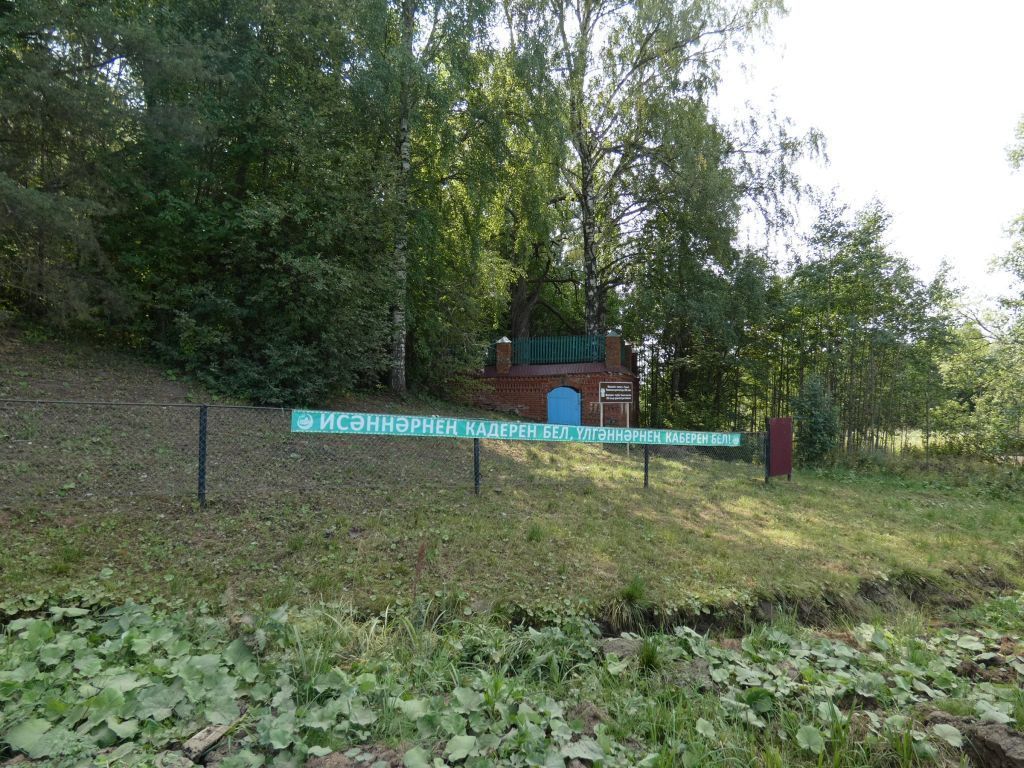 1. Градостроительные характеристики1.1 Расположение в северо-западном углу сельского кладбища близавтодороги Танып- Константиновка1.2 Бассейн визуального восприятияс автодороги с удалением в сторону Таныпа – 200 м, в сторону Константиновки – 50 м, с открытого пространства с севера и с юга с удалением до 100 м2. Архитектурные особенности (экстерьер)2.1 Объемно-пространственные характеристики – квадратное в плане сооружение, состоящее из кирпичных стен на бутовом фундаменте с навершием в виде кирпичных столбиков и ограды- штакетника2.2 Материал стен – полнотелый керамический кирпич 2-й половины 19 в. 2.3 Материал фасадной поверхности – лицевая кирпичная кладка с расшивкой швов2.4 Характер декоративной отделки фасадов в стилистике архитектурной эклектики начала 20 в.:2.4.1 - венчающий карниз из рядов горизонтальных и вертикального поребриков, рустованные лопатки по флангам и центру фасадов, филенки в центре, заполненные поребриком, два пояса поребрика над цоколем2.4.2 - лучковый проем в северной стене с деревянным плотницким дверным заполнением3. Предметы прикладного искусства3.1 каменное надгробие с рельефными текстами, выполненными арабской вязью4. Мемориальные особенности4.1 Подземные захоронения мусульманских священников и преподавателей Таныпского медресе