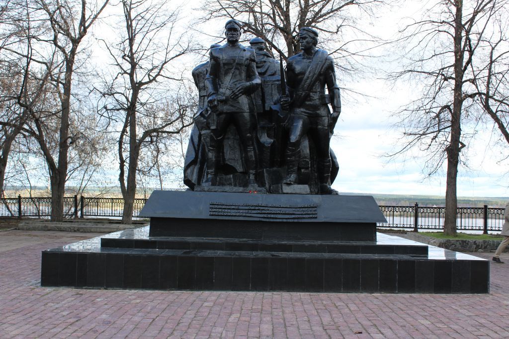 Памятник расположен в сквере им. Решетникова на высоком берегу р. Камы, между ул. Орджоникидзе и железной дорогой.Бассейн визуального восприятия ограничен аванплощадью перед зданием по ул. Монастырская, 15, территорией сквера им. Решетникова.Многофигурная скульптурная композиция изображает командира, солдата, рабочего, матроса, женщину и раненого бойца, которые представляют борцов революции, силами которых из Перми были изгнаны войска Колчака.Квадратный в плане ступенчатый постамент, облицованный черным полированным гранитомНа лицевой грани постамента укреплена чугунная доска с рельефным текстом: «ПОЗДРАВЛЯЮ ГЕРОИЧЕСКИЕ КРАСНЫЕ ВОЙСКА, ВЗЯВШИЕ ПЕРМЬ И КУНГУР. ГОРЯЧИЙ ПРИВЕТ ОСВОБОДИТЕЛЯМ УРАЛА. ПРЕДСОВОБОРОНЫ ЛЕНИН. 1 ИЮЛЯ 1919».