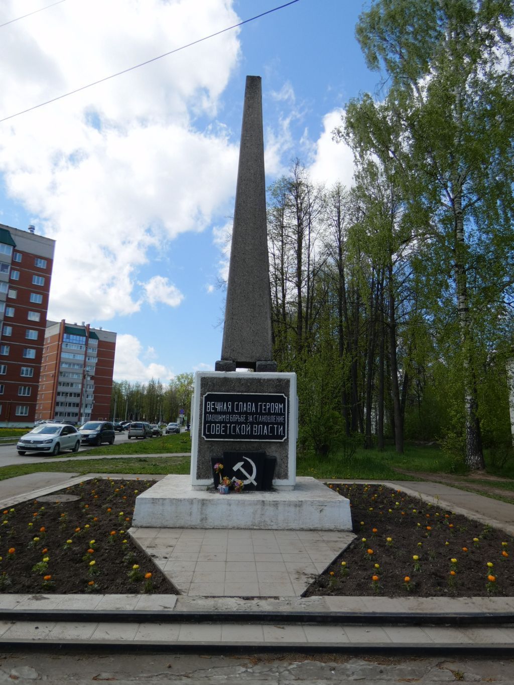 1 Расположение на пересечении ул. Камская и Камского переулка с образованием сквера2 Бассейн визуального восприятия вдоль улиц Камская и Камского переулка3 Подземное групповое захоронение участников Гражданской войны 1918- 1922 гг.4 Железобетонный обелиск с металлическими мемориальными плитами на гранях основания: «Вечная память героям, павшим за установление Советской власти». «Юрков Тимофей Артемьевич, Щелканов Фома Иванович, Горбунов Андрей Васильевич, Анисимов Кузьма Иванович, Мущинкин Иван Абрамович». «Балабанова Татьяна Прохоровна, Коровин Федор Ильич, Соломенников Федор Тимофеевич, Комов Василий Павлович, Карнапольцев Михаил Яковлевич, Гудков Сергей Сергеевич». «Они отдали свои жизни за светлое будущее человечества».5 Благоустройство территории