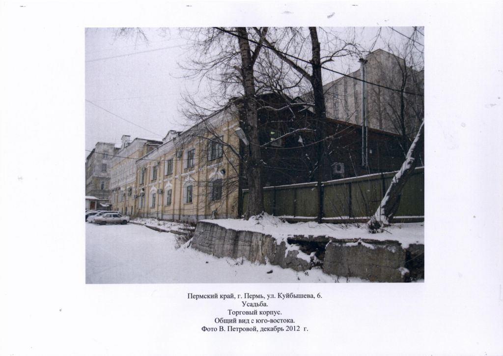 1. Градостроительные характеристики:1.1Местоположение – в центральной части города, на склоне горы Слудка, в северо-восточном углу площади Окулова (бывшего Черного рынка).1.2.Композиционная значимость (роль) в структуре окружающего природного и культурного ландшафта, городского квартала, ансамбля, домовладения – фиксирует северную границу бывшей площади Черного рынка.1.3Габариты, силуэт – усадьба включает в себя 6 объектов, расположенных по периметру усадьбы и образующих каре:- главный дом- торговый корпус- флигель- хозяйственный корпус- ворота- стена-брандмауэр1.4Бассейн видимости – в границах застройки улицы Куйбышева от южного фасада здания по Монастырской, 12а до улицы Советской, в границах застройки улицы Монастырской из дворового пространства между домами по Куйбышева, 11 и 9б от восточного фасада здания по Куйбышева,11, из дворового пространства между домами по Советской, 62 и 64 от западного фасада дома по Советской,62. 2. Архитектурные и конструктивные характеристики:2.1Объемно-пространственная композиция на дату строительства – юго-западный угол усадьбы формирует «Г»-образный 2-этажный кирпичный главный дом (а) со скругленным углом. Вплотную к восточному торцу особняка примыкает 2-этажный кирпичный торговый корпус (в), главным фасадом обращенный на юг. Северо-западный угол усадьбы формирует 1-этажный кирпичный флигель (б), главный фасад выходит на запад на ул. Куйбышева.Особняк и флигель соединены между собой кирпичными воротами. Восточную часть двора замыкает кирпичный хозяйственный корпус (г). Корпус одноэтажный, в центральной части 2 этажа (сеновал над конюшней). Главный западный фасад обращен во двор. Северную сторону каре двора ограничивает кирпичная стена-брандмауэр (д) высотой 4 м.Габариты усадьбы в плане 45х54 м.2.2.Композиция и архитектурно-художественное оформление фасадов:2.2.1Главный дом:2.2.1.1Объемно-пространственное решение – «Г»-образное в плане со скругленным юго-западным углом2.2.1.2Материал стен – керамический полнотелый кирпич 19 в.2.2.1.3Материал фасадной поверхности – лицевая кладка с расшивкой, окраска по кирпичу2.2.1.4Расположение, габариты и историческая расстекловка оконных проемов. Оконные заполнения на период строительства – деревянные двойные створные с глухой фрамугой2.2.1.5Аттики со слуховыми окнами над западным и южным фасадом 2.2.1.6Венчающий карниз на сухариках и плоских кронштейнах, филенчатый фриз2.2.1.7Арочные окна второго этажа в обрамлении архивольтов с килевидным завершением на пилястрах, под окнами – филенки с концентрическими розетками 2.2.1.8Окна первого этажа с лучковыми перемычками в обрамлении узких рамочных наличников (дворовый фасад) и полуналичников с замковыми камнем2.2.1.9Междуэтажный карниз с зубцами и сухариками2.2.1.10Трехчетвертные колонки по углам фланговых ризалитов западного фасада на уровне второго этажа2.2.1.11Лопатки с трехчетвертными колонками на уровне второго этажа и рустованные на первом этаже на западном и южном фасаде, рустованные стены первого этажа2.2.2Флигель.2.2.2.1Объемно-пространственное решение – прямоугольное в плане с пристройкой-тамбуром к восточному фасаду2.2.2.2Материал стен – керамический полнотелый кирпич 19 в.2.2.2.3Материал фасадной поверхности – лицевая кладка с расшивкой, окраска по кирпичу2.2.2.4Расположение, габариты и историческая расстекловка оконных проемов. 