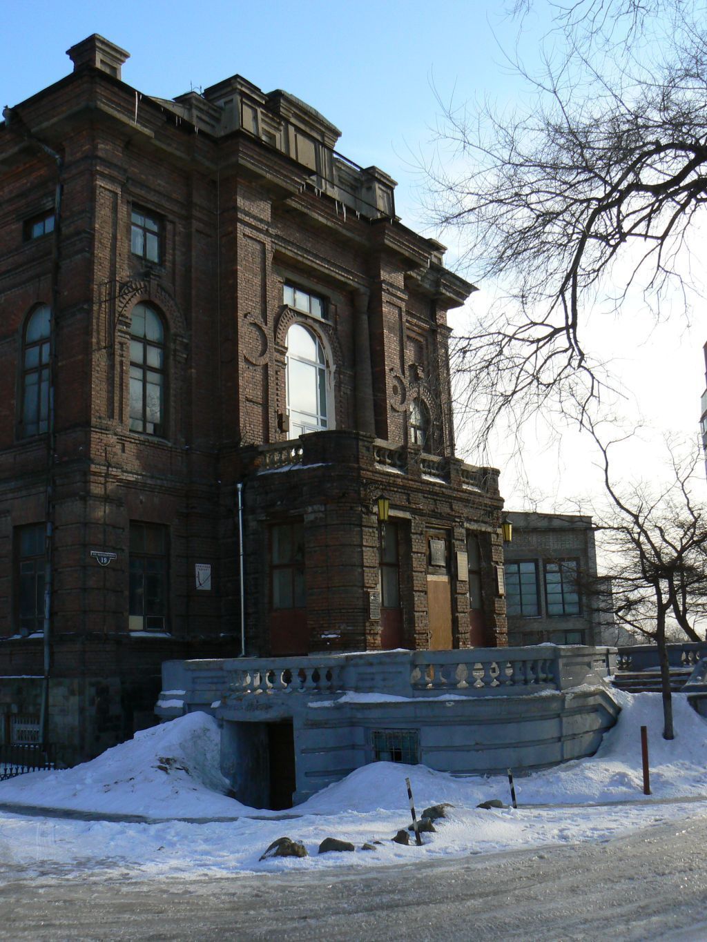 1.Градостроительные характеристики:- местоположение здания на склоне, главным торцовым фасадом под углом к улице Володарского, на завершении оси улицы Пушкинской.2. Объемно-пространственная композиция:- прямоугольный в плане двухэтажный основной объем памятника и примыкающая к нему с северо-западной стороны вспомогательная часть здания сложной конфигурации;- высотные отметки по венчающим карнизам здания;- конфигурация крыши, ее размеры, высотные отметки.3.Конструктивная система здания:- фундаменты здания, их форма, расположение, материал изготовления (бутовые);- продольно-поперечные несущие стены;- плоские и сводчатые перекрытия.4. Кровля:- материал кровельного покрытия из листовой кровельной стали с фальцевыми замками;- слуховые окна, их форма и расположение.5. Композиция и архитектурно-художественное решение (деталировка) фасадовГлавный юго-западный фасад:- трехчастная композиция с выступающим одноэтажным ризалитом; - силуэт фасада;- балкон, его расположение, форма, ограждение, выполненное чередованием кирпичной кладки и бетонной балюстрады;- рустованная поверхность фасада в уровне первого этажа, решенная выпуском кирпичной кладки;- форма, местоположение пилонов, их оформление с трех сторон вертикальной нишей с декоративным элементом в форме круга;- приставные колонны, их форма и расположение;- первоначальные оконные проемы, их форма, местоположение и перемычки; заполнение оконных проемов деревянными оконными блоками, рисунок расстекловки;- декоративные элементы арочных перемычек – замковый камень, сухарики; импосты;- лопатки с вертикальными нишами;- аттик;- развитый венчающий карниз, повторяющий форму выступающих элементов фасада.Юго-восточный фасад:- композиция фасада, решенная путем чередования небольших выступающих ризалитов и западающих плоскостей с осью симметрии, смещенной вправо;- силуэт фасада;- рустованная поверхность фасада в уровне первого этажа, решенная выпуском кирпичной кладки;- форма, местоположение пилонов;- приставные колонны, их форма и расположение;- антаблементы; трехступенчатый аттик; треугольные фронтоны; импосты; лопатки;- оконные проемы, их форма, местоположение и перемычки; заполнение оконных проемов деревянными оконными блоками, рисунок расстекловки;- декоративные элементы арочных перемычек – замковый камень, сухарики;- дверные проемы, их местоположение, заполнение дверьми с филенками;- развитый венчающий карниз, повторяющий форму выступающих элементов фасада.Северо-восточный фасад:- силуэт фасада; пятиугольный фронтон, его форма, высотные отметки;- оконные проемы, их форма, местоположение и перемычки; декоративные элементы арочных перемычек – замковый камень, сухарики;- проем для ворот, его размеры, клинчатая перемычка; импосты.Северо-западный фасад:- силуэт фасада; венчающий карниз проходящий по основной части здания и вспомогательной; импосты;- первоначальные оконные проемы, их форма, местоположение и перемычки; рисунок заполнения оконных проемов; замковые камни на арочных перемычках;- шестигранная кирпичная труба, ее форма, местоположение, высотные отметки, декоративные элементы в виде карнизов и двух импостов с сухариками между ними.Парадное крыльцо на юго-западном фасаде:- высотные отметки, форма, габаритные размеры, местоположение;- материал изготовления – кирпичные стен