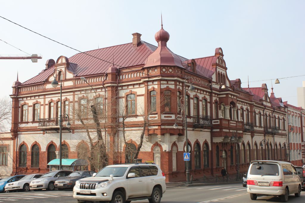 1. Градостроительные характеристики:- местоположение в планировочной структуре исторической застройки центральной части города Владивостока на склоне горы Почтовая, в квартале ограниченном улицами: Светланская, Уборевича, Адмирала Фокина, Океанский проспект;- градостроительные характеристики здания, занимающего угловое положение на пересечении улиц Светланская и Уборевича, выполняющего градоформирующую роль в объемно-пространственной и планировочной структуре центральной части г. Владивостока, представляющего собой пример парадной исторической общественной застройки начала ХХ века.- расположение здания: парадный (южный) фасад - вдоль ул. Светланской, парадный (восточный) фасад - вдоль ул. Уборевича, северный фасад - дворовый.2. Объёмно-пространственная композиция и пространственно-планировочная структура здания:- объемно-пространственная композиция трехэтажного кирпичного близкого к квадрату в плане здания с подвальным и мансардным этажами;- первоначальная пространственно-планировочная структура здания, образованная продольными и поперечными капитальными несущими стенами и перекрытиями в габаритах капитальных стен, сформированная преимущественно зальной структурой помещений, объединенных открытой парадной лестницей, двумя лифтовыми шахтами, служебной лестничной клеткой по вертикали, коридорами и холлами - по горизонтали;- конфигурация крыши с высокими фигурными фронтонами и двумя башнями с шатровыми кровлями, увенчанными шпилями и угловыми башенками;- высотные отметки по конькам скатов кровли, верхние отметки завершений фронтонов и шатровых кровель башен.3. Конструкции и материал фундаментов, капитальных стен, перекрытий, лестниц, крыши, отделки фасадной поверхности здания:- конструкции и материал ленточных бутовых фундаментов под наружные и внутренние несущие стены, выполненные из необработанного и тесанного природного камня;- конструкции и материал капитальных стен первого, второго, третьего и мансардного этажей из полнотелого керамического кирпича;- конструкция четырехскатной кровли по деревянной стропильной системе, металлическое кровельное покрытие с фальцевыми замками;- конструкция и материал шатровых крыш двух башен, металлическое кровельное покрытие с фальцевыми замками;- перекрытия железобетонные плоские оштукатуренные, в помещениях подвала и зала первого этажа в северной части здания кирпичные лучковые своды по металлическим балкам;- конструкции и материал открытой парадной лестницы;- конструкции и материал служебной лестницы; наборные бетонные ступенями с мраморной крошкой по металлическим косоурам;- материал и характер отделки поверхностей: парадные фасады - фасадный лицевой кирпич светло-серого цвета, высококачественная штукатурка простенков под «шубу», дворовые фасады - полнотелый красный керамический фасадный лицевой кирпич с английской перевязкой швов.4. Композиционное решение фасадовПарадный (южный) фасадТрехосное симметричное композиционное решение сформировано:- членением плоскости фасада здания по горизонтали на пять частей центральным одноосным ризалитом, двумя крайними трехосными ризалитами и двумя трехосными простенками; - членением плоскости фасада по вертикали венчающим карнизом, междуэтажными поясками и карнизами;- вальмовой крышей с высокими фигурн