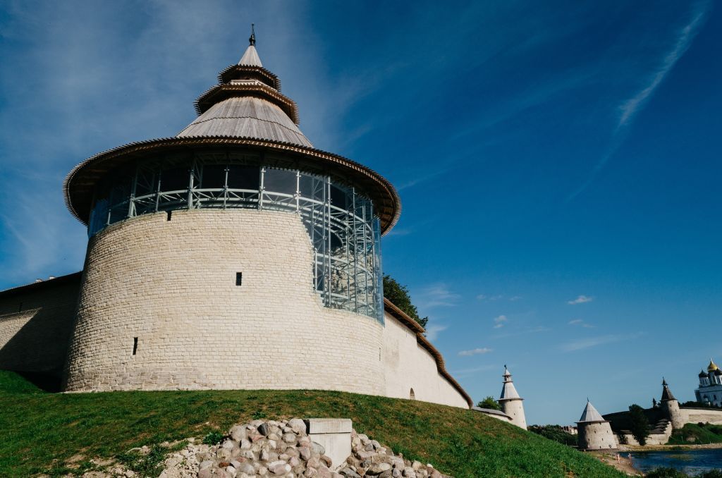 Фрагменты объемно-пространственной композиции башни; первоначальная и историческая планировка башни: наружный и внутренний диаметры;  формы фрагментов башни; высота сохранившихся фрагментов башни по наружному периметру, от уровня первоначальной дневной поверхности до верхних отметок лицевой кладки и забутовки;  высота примыкания ходовых площадок северного и западного прясел крепостных стен;фрагмент кладки башни на западном склоне берега р. Великой, его параметры  с учетом технического состояния кладки: архитектурные и конструктивные детали фрагмента - элементы бойниц, арочных перемычек; материал фрагмента - известняковая плита, характер обработки, связующие;  фрагменты первоначальных и исторических обмазок и колеров;фасады: расположение первоначальных и исторических проемов бойниц, вылазных ворот, входных проемов на ходовые площадки примыкающих прясел: параметры и наружные формы входных проемов и бойниц; характер кладки фасадов; сохранившиеся маячные ряды кладки и их фрагменты; фрагменты первоначальной обмазки фасадов;интерьеры: первоначальная и историческая планировка башни с учетом ранней постройки меньшего диаметра; пространственные характеристики интерьеров башни: высота сохранившихся фрагментов башни по внутреннему периметру, от уровня первоначальной дневной поверхности до верхних отметок лицевой кладки и забутовки; три боевых яруса и их фрагменты;  расположение камерных бойниц, входных проемов, служебных ниш;  параметры и формы арочных перемычек и формы бойниц; параметры и формы входных проемов с ходовых площадок, их фрагменты; параметры и формы первоначальных и исторических лестниц, их фрагменты; каналы связей, гнезда закладных брусьев от мостов - перекрытий, гнезда строительных лесов; характер кладки интерьеров; сохранившиеся маячные ряды кладки и их фрагменты, отдельные маячные камни; фрагменты первоначальных и исторических обмазок и колеров;все подлинные конструкции независимо от их технического состояния;фундаменты: тип фундаментов и материал – ленточные бутовые, фундаменты башни с учетом ранней постройки меньшего диаметра: глубина заложения фундаментов ранней и поздней постройки; стены: материал основания первоначальной башни – известняковая плита;  материал стен существующей башни – тесаная известняковая плита, связующие - известково-песчаный раствор;  исторические вычинки, закладки, их материалы, наружная и внутренняя обмазка;перекрытия: конструкции, уровни и формы сводчатых перекрытий камерных бойниц; фрагменты перемычек входных проемов; детали: металлические закладные детали входных проемов - поставы.