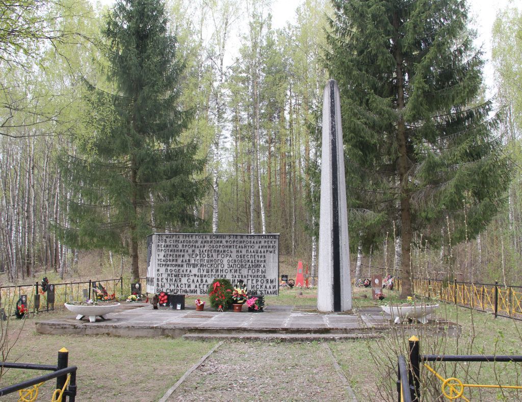 1. Градостроительные характеристики: Местоположение: в 0,4 км к западу от деревни Чертова Гора.2. Объемно-пространственная композиция: Захоронения, перезахоронения (могилы с останками); трехплоскостная стела на четырех опорах-блоках; обелиск в виде штыка.3. Строительные конструкции, материал и техника исполнения: Стела -материал - железобетон; обелиск - материал - железобетон.4. Архитектурно-художественное оформление: Надписи: на северо-восточной плоскости стелы «26 МАРТА 1944 ГОДА ВОИНЫ 578 И 435 ПОЛКОВ 208 СТРЕЛКОВОЙ ДИВИЗИИ ФОРСИРОВАЛИ РЕКУ ВЕЛИКУЮ. ПРОРВАЛИ ОБОРОНИТЕЛЬНУЮ ЛИНИЮ ПРОТИВНИКА И ЗАКРЕПИЛИСЬ НА ПЛАЦДАРМЕ У ДЕРЕВНИ ЧЕРТОВА ГОРА, ОБЕСПЕЧИВ УСЛОВИЯ ДЛЯ УСПЕШНОГО ОСВОБОЖДЕНИЯ ТЕРРИТОРИИ ПУШКИНСКОГО ЗАПОВЕДНИКА И ПОСЕЛКА ПУШКИНСКИЕ ГОРЫ ОТ НЕМЕЦКО-ФАШИСТСКИХ ЗАХВАТЧИКОВ. ВЕЧНАЯ СЛАВА ПАВШИМ ГЕРОЯМ! ВЫ УЧАСТИ ЛЕГКОЙ СЕБЕ НЕ ИСКАЛИ, ВЫ СМЕРТНЫМИ БЫЛИ – БЕССМЕРТНЫМИ СТАЛИ»;на восточной плоскости стелы в верхнем левом углу неполный барельеф лица в профиль воина в каске, внизу - даты: «1941 – 1945»; на обратной стороне стелы (на юго-западной плоскости) «ОБЕЛИСК ОТКРЫТ 12 ИЮЛЯ 1969 ГОДА ПОСТРОЕН НА СРЕДСТВА КОЛХОЗОВ НОВЫЙ ПУТЬ И ОКТЯБРЬ»; габариты символов, орфография, исторический текст, вид исполнения надписи.