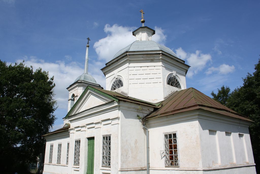 Объёмно-планировочная композиция храма, состоящая из следующих частей: квадратный в плане четверик, над которым возведён световой восьмерик на тромпах, перекрытый восьмигранным сводом храма; прямоугольная в плане апсида, примыкающая к четверику с восточной стороны; прямоугольные в плане «карманы», как части своеобразного трансепта, примыкающие к четверику с юга и с севера; прямоугольная в плане, вытянутая в направлении запад-восток, трапезная, примыкающая к четверику главного храма с западной стороны; квадратная в плане трёхъярусная колокольня, примыкающая к трапезной с западной стороны; прямоугольное в плане, вытянутое в направлении запад-восток, закрытое крыльцо, замыкающее композицию храма с западной стороны;кирпично-штукатурный декор, включающий в себя следующие элементы: упрощённого профиля элементы классицистического декора фронтонов и пилястр северного и южного портиков; венчающие карнизы, архивольты над полуциркульными окнами восьмерика; подоконный однополочный поясок по всему периметру основного объёма храма; треугольные сандрики над проёмами первого яруса колокольни; рустованная поверхность стен восьмерика; профилированный карниз по внутренней поверхности основания свода над восьмериком; профилированные тяги на завершениях столбов под арочными проёмами стен четверика; материал и конструкции: стен храма - полнотелая кирпичная кладка преимущественно голландской системы перевязки, на известково-песчаном растворе; перекрытий храма: над восьмериком – кирпичный сомкнутый восьмигранный свод; над апсидой и «карманами» трансепта кирпичные сомкнутые трёхгранные своды; над ярусами колокольни – плоские деревянные перекрытия по балкам; материал внутренней и наружной отделки штукатурка стен известково-песчаным раствором; габариты и пропорции всех ниш, первоначальных оконных и дверных проёмов, а также всех арочных проёмов в храме в колокольне; детали: кованые дверные подставы; кованые решётки на окнах; кованые затяжки в арочных проёмах стен четверика.