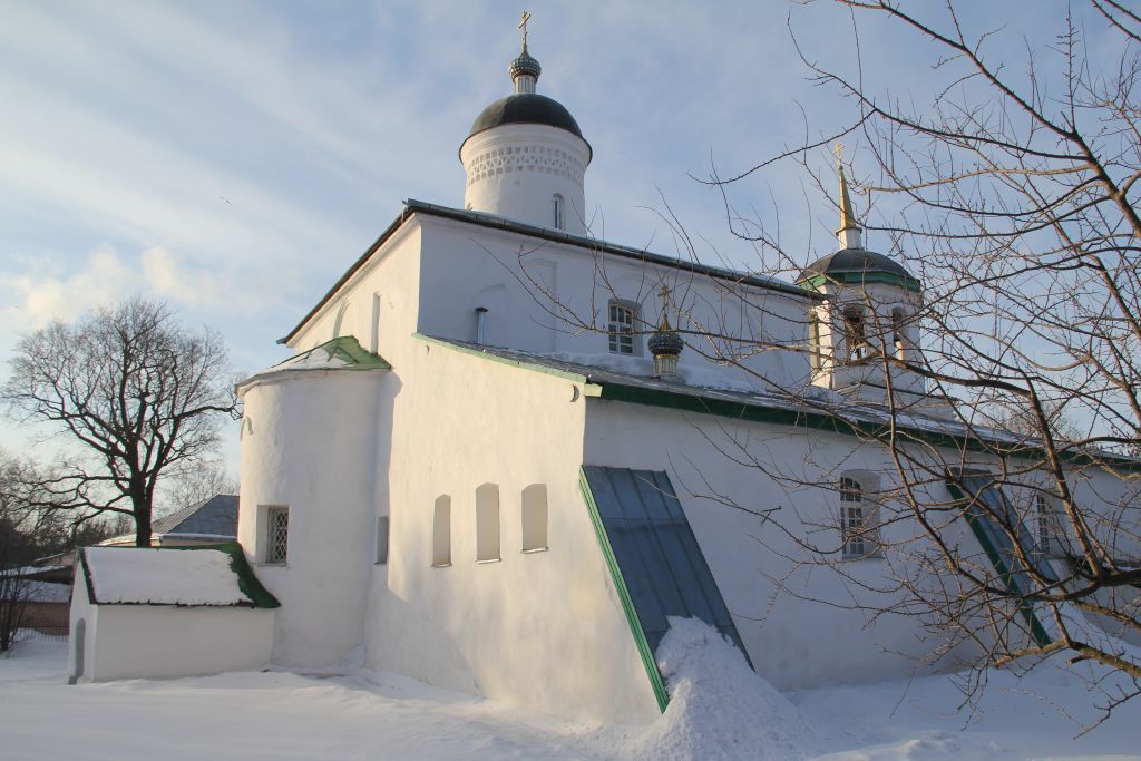 Объёмно-планировочная композиция храма, состоящая из следующих частей: четырёхстолпный четверик с примыкающей апсидой, имеющей в плане форму неправильной дуги, увенчанный каменным световым барабаном с шлемовидным куполом и навершием в форме малого глухого декоративного барабана с куполом; притвор, примыкающий к западной стене четверика на всю его ширину; северный придел, пристроенный к четверику и притвору на всю их длину; южный придел с алтарной частью, отделённой каменной стеной, пристроенный к четверику и притвору на всю их длину; трёхъярусная колокольня типа «восьмерик на четверике» (два нижних яруса – прямоугольные в плане, слегка вытянутые по оси восток-запад; верхний ярус звона – восьмерик, также слегка вытянутый в плане по оси восток-запад; нижний ярус колокольни – проходной, с проёмами во всех четырёх стенах); каменное одномаршевое крыльцо, пристроенное к западной стене колокольни; двухчастная терраса-«гульбище», примыкающая с запада к четверику и к южному приделу на всю их ширину; каменный высокий подклет под всеми перечисленными выше частями здания, кроме крыльца; палатка, пристроенная к северной стене северного придела, заподлицо с его западной стеной; контрфорсы, подпирающие северную стену северного придела; крыльца-спуски в подклет, примыкающие к апсиде и к восточной стене южного придела;материал наружных и внутренних стен и столбов: кладка из известняковых плит на известково-песчаном растворе;материал (кладка из известняковых плит на известково-песчаном растворе), пропорции и пространственные характеристики (отметки пят и шелыг, высота подъёма) алтарной конхи, арок, сводов, распалубок в четверике, колокольне, подклете, приделах и притворе;тромпы, сохранившиеся в уровне второго яруса колокольни;форма покрытия купола (полусферический шлемовидный свод, увенчанный малой главкой), колокольни (восьмискатное шлемовидное покрытие со шпилем) и приделов (скатная чердачная крыша);местоположение и габариты всех оконных и дверных проёмов (в том числе заложенных ранее), а также ниш и киотов во всех перечисленных выше частях памятника;декоративные и функциональные элементы обрамления оконных и дверных проёмов (лепные профилированные наличники, ставенные и дверные ниши, пазы для засовов, растёсы внутренних углов дверных проёмов);лепные профилированные тяги и архивольты, обрамляющие арочные проёмы в четверике;стальные кованые затяжки арок и сводов, сохранившиеся в стенах первого и второго ярусов колокольни;исторические кованые решётки и подставы в оконных проёмах;винтовая лестница из чугунных ступеней, ведущая на хоры;хоры (отметка расположения, габариты, материал и архитектурно-конструктивное решение площадки);керамические трубы системы воздушного отопления, вмурованные в стены и своды подклета; архитектурный декор фасадов: традиционный псковский орнамент на барабане, сандрики - бровки на апсиде и над окнами южного придела; лопатки и «позакомарные» арочки на фасадах четверика; архитектурный декор (профилированные базы и капители) пилонов крыльца; многоступенчатый венчающий карниз на барабане и на верхнем ярусе колокольни, а также на завершении четверика колокольни;две керамиды, вмурованные в западную стену «гульбища» и в южную стену четверика (со стороны южного придела);обитые железом западные врата