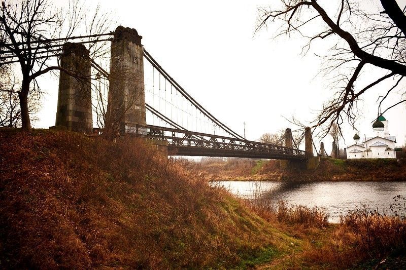 объемно-пространственная композиция мостового перехода, состоящая из двух однопролетных цепных мостов; материал и конструкция моста, включающая: металлические цепи, состоящие из двух ветвей плоских звеньев по шесть в ряд, соединенных горизонтальными болтами; вертикальные металлические подвески; металлические фермы жесткости, состоящие из верхнего и нижнего поясов, выполненных из клепаных двутавров, соединенных между собой стойками и подкосами; гранитные бутовые пилоны на гидравлическом растворе с чугунными декоративными навершиями, закрывающими опорный узел цепей, состоящий из чугунных оголовков и чугунных роликов; декоративные гранитные навершия на гидравлическом растворе, закрывающие опорные узлы цепей, включающие гранитные камни-анкеры, чугунные анкерные коробки; металлические галереи с лестницами; береговые устои мостов (пьедесталы), заложенные в твердом плитяном грунте и облицованные гранитной бутовой плитой на гидравлическом растворе; чугунные ажурные ограждения верхней площадки пьедесталов;металлическая проезжая часть;первоначальные размеры всех элементов конструкции моста;детали: рваные сквозные отверстия, оставшиеся со времен Великой Отечественной войны.
