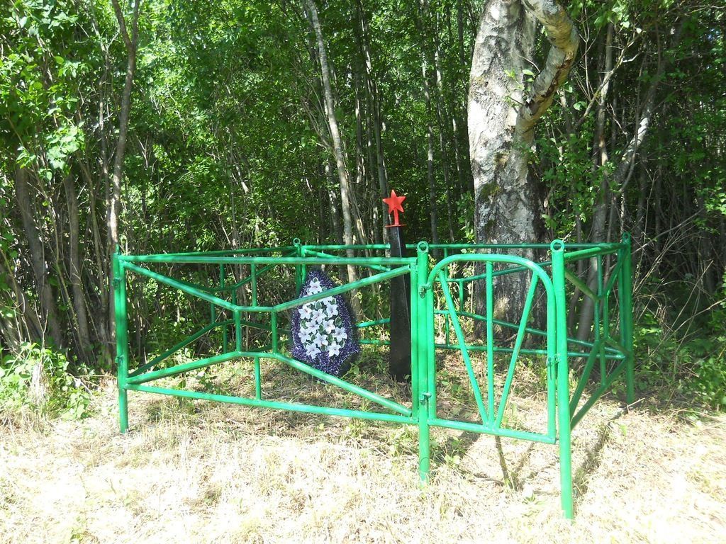 1. Градостроительные характеристики: Местоположение: в юго-западной части деревни.2. Объемно-пространственная композиция: Захоронение (братская могила с останками); обелиск с пятиконечной звездой; ограда.3. Строительные конструкции, материал и техника исполнения: Обелискс пятиконечной звездой - материал – металл, покраска; ограда - материал – металл, покраска.