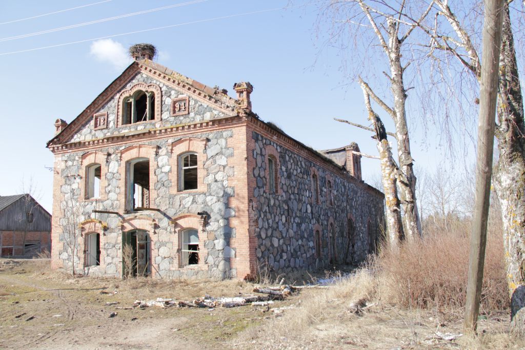 Объемно-пространственная композиция прямоугольного в плане здания с мезонином, состоящая из трех объемов, разделенных капитальными стенами;архитектурная композиция фасадов: габариты, местоположение, форма оконных проемов с расстекловкой; габариты, местоположение и форма дверных и воротных проемов; местоположение балкона; столбики с филенками, венчающие треугольный фронтон центрального фасада; местоположение, габариты и форма трехчастного окна фронтона центрального фасада и трехчастного окна мезонина; габариты здания в пределах несущих и капитальных стен; габариты, конфигурация, высотные отметки двускатной кровли, ее уклоны; декор фасадов: сочетание валунной кладки стен с красно-кирпичным декором; закрепление углов здания кирпичными лопатками; венчающий карниз с рядом сухариков; широкие фигурные наличники, повторяющие лучковую форму оконных, дверных и воротных проемов; полуциркульное завершение окна мезонина с устройством ложных боковых окон с филенками; окно фронтона центрального фасада здания; квадратные филенки с датой строительства здания на фронтоне центрального фасада;в интерьере: рассветы исторических оконных и дверных проемов; местоположение и габариты ниш; местоложение и габариты лестниц;материал и конструкции: первоначальные конструкции, материал и глубина заложения фундаментов; стены - околотые гранитные валуны, красный кирпич;кованые оконные и дверные подставы; кольца.