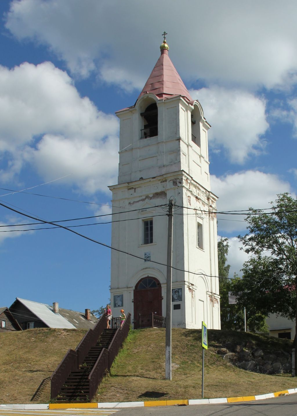 1. Градостроительные характеристики: Местоположение: юго-восточная часть города Себеж в центральной части «Замкового» полуострова.2. Объемно-пространственная композиция: Габариты в плане и высотные отметки трехъярусного, квадратного в плане здания с шатровой кровлей, завершенной граненой главкой, яблоком и крестом.3. Пространственно-планировочная структура интерьеров в пределах капитальных стен и перекрытий; перекрытие верхнего яруса колокольни парусным сводом; местоположение, габариты, конструкция, материал деревянной междуэтажной лестницы с деревянными перилами и поручнями; местоположение, конфигурация, габариты внутристенной каменной лестницы, ведущей на второй ярус колокольни.4. Конструктивное решение, материал и техника исполнения: Тип кладки стен – кирпичная кладка.5. Композиционное и архитектурное решение фасадов: Элементы кирпично-штукатурного декора: Классический карниз с широким фризом, без архитрава, венчающий профилированный карниз, прорезанный арочными проемами звона с поднятыми над ним арками, прорезающими основание восьмигранного шатра, профилированная тяга с опирающимися по оси фасадов архивольтами, угловые лопатки (сдвоенные в уровне второго яруса и обработанные филенками в уровне первого яруса), профилированные наличники, завершенные килевидными кокошниками, угловые и подоконные филенки; местоположение, габариты, форма оконных и арочных дверных проёмов с деревянными заполнениями; форма и тип расстекловки оконных заполнений и арочных фрамуг над дверными заполнениями.6. Архитектурно-художественное оформление интерьеров: Элементы декоративного оформления интерьеров: клинчатые перемычки над оконными проемами второго яруса и над оконной нишей, расположенной на юго-западной стене; лучковые перемычки над оконными проемами яруса звона.