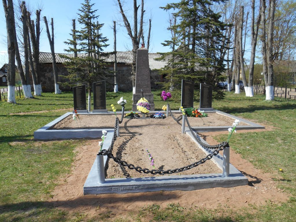 1. Градостроительные характеристики: Местоположение: центральная часть деревни Самолва.2. Объемно-пространственная композиция: Захоронения, перезахоронения (могилы с останками); обелиск с красной звездой в верхней части на двухступенчатом постаменте.3. Строительные конструкции, материал и техника исполнения: Двухступенчатый постамент: материал – железобетон; обелиск: материал – гранит.