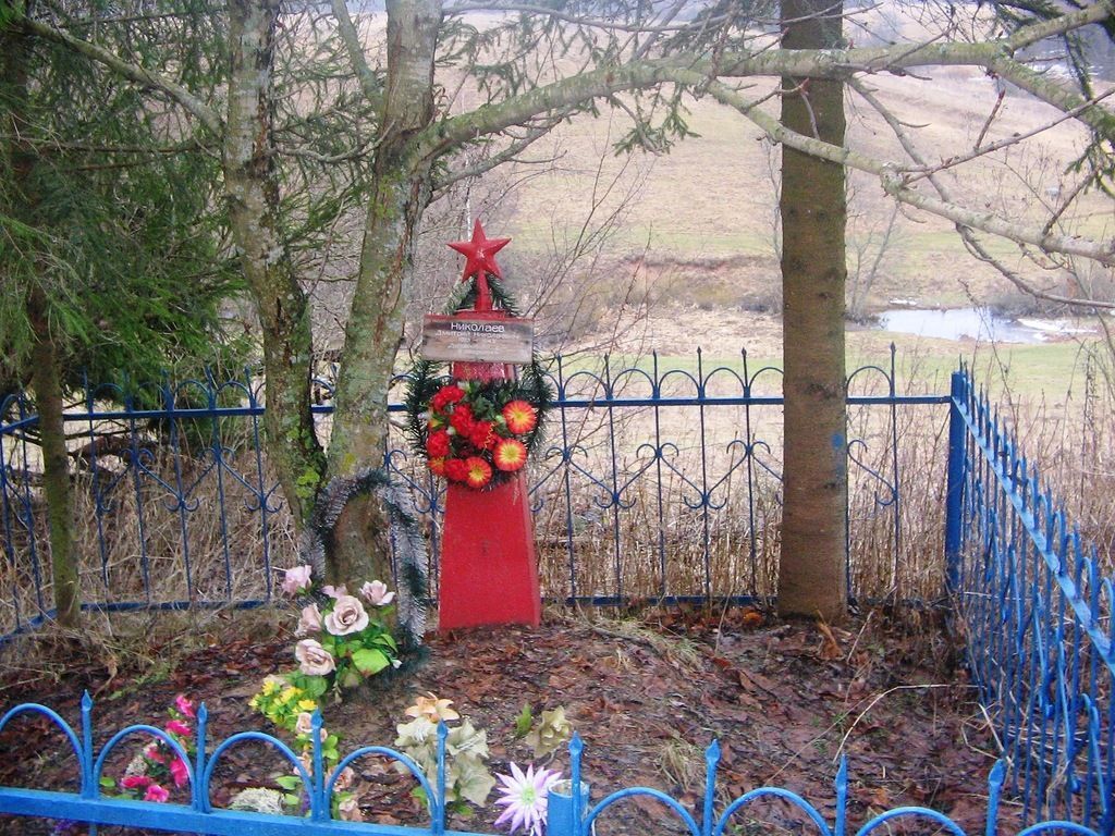 1. Градостроительные характеристики: Местоположение: к северо-востоку от границы д. Друсино, в восточной части деревенского кладбища.2. Объемно-пространственная композиция: Захоронение (могила с останками); обелиск с пятиконечной звездой и табличкой; цветник; ограда.3. Строительные конструкции, материал и техника исполнения: Обелискс пятиконечной звездой; - материал – металл, покраска; цветник - материал – нержавеющая сталь; ограда - материал – металл, покраска.4. Архитектурно-художественное оформление: Текст таблички: «НиколаевДмитрий Николаевич 1923 – 1942 Дедовичский р-н д. Хверщёвка Вечная память». Шрифт, габариты символов, тип исполнение надписи.