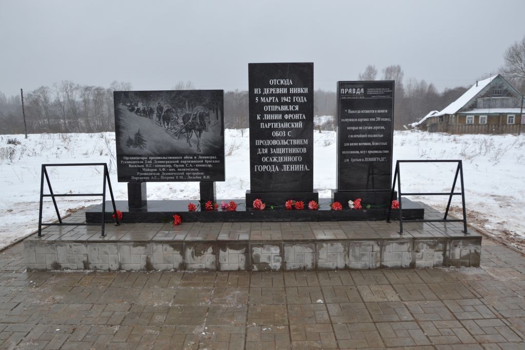 Место, откуда З марта 1942 г. был отправлен по тылам врага обоз с продовольствием в осажденный Ленинград, На этом месте установлена стела