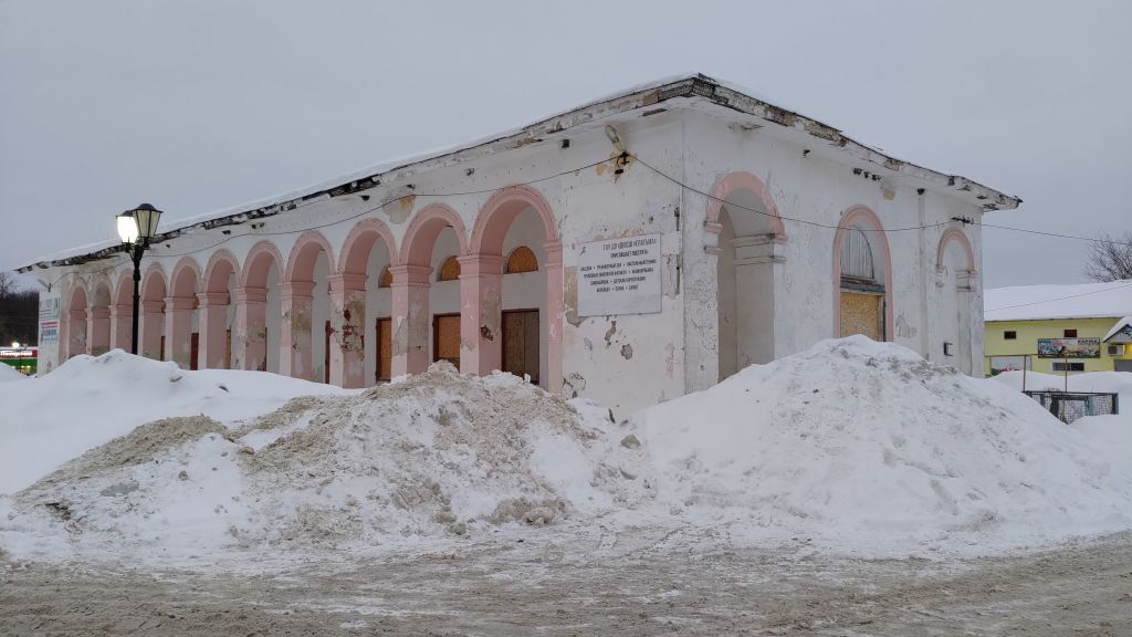 Предметом охраны объекта культурного наследия регионального значения «Два корпуса торговых рядов», XIX в.» являютсяградостроительная характеристика здания торговых рядов, расположенного в центре главной площади;объемно-пространственная композиция прямоугольного в плане одноэтажного, повышенного антресольным этажом, вытянутого корпуса, с открытой арочной галереей в 11 осей западного фасада (арочная галерея восточного фасада утрачена, целесообразно восстановить при проведении научной реставрации); вальмовая форма, габариты, угол наклона скатов и высотные отметки по коньку крыши;местоположение, габариты, конфигурация и оформление дверных и оконных проемов: осевое расположение, прямоугольная форма, дверных и оконных проемов; полукруглая форма небольших окон антресольного этажа, размещенных над каждым проемом основного этажа; композиция и архитектурно-художественное оформление фасадов, включая основные элементы декоративного убранства, которыми являются: полуциркульные арки, обрамленные профилированными архивольтами на импостах, опирающимися на прямоугольные столбы (на белокаменных основаниях) галереи; мелко профилированный архивольт, очерчивающий высокий средний проем трехчастного окна с подоконными филенками торцевого фасада; подшивной, с выносом, венчающий карниз;конструкции капитальных фундаментов; кирпичных стен; перекрытий: подвальные – кирпичные своды; межэтажные – плоские; материал капитальных стен: красный кирпич; облицованный белым камнем цоколь; материал кровли: листовой металл; характер обработки фасадной поверхности здания: оштукатуренные поверхности наружных стен.Предмет охраны может быть дополнен в процессе проведения научной реставрации.