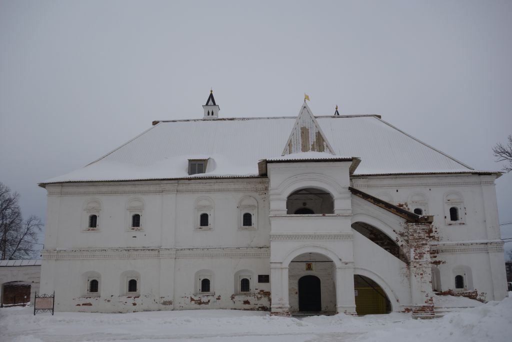градостроительная характеристика здания, расположенного на территории ансамбля; объемно-пространственная композиция прямоугольного в плане двухэтажного здания, имеющего двухэтажное каменное крыльцо с арочными и ползучими арочными проёмами; небольшая ретирада (на два этажа), расположенная на восточном фасаде; вальмовая форма крыши основного объема, четырехгранный шатер крыльца; габариты и высотные отметки по коньку крыши;местоположение, габариты, конфигурация и оформление дверных и оконных проемов здания; небольшие прямоугольные и арочные (с лучковым завершением) формы окон, не связанные общим ритмом; в нижнем этаже заглублены в ниши с коробовой перемычкой, в верхнем – обрамлены наличниками; материал и характер заполнения дверных и оконных проемов; композиция и архитектурно-художественное оформление фасада, характерного для середины XVII в., включая основные элементы декоративного убранства, которыми являются: сильно профилированные подкарнизный венчающий пояс и междуэтажный карниз (с рядами поребрика у основания), опоясывающие фасады по всему периметру; лопатки, фланкирующие углы здания, и лопатки, членящие объём; наличники окон второго этажа в виде полукруглых в плане полуколонок и сегментным завершением; массивный уступчивый карниз с треугольным фронтоном, завершающий входной портал на верхней площадке крыльца; позолоченный, в виде флажка, флюгер; конструкции капитальных фундаментов: бутовые;материал и техника кладки капитальных стен: красный большемерный кирпич, выложенный разной техникой кладки (верстовой и крестовой); материал кровли: тесовое покрытие крыши;характер обработки фасадной поверхности здания, оштукатуренные поверхности наружных стен, включая оштукатуренный белокаменный цоколь с докладкой красного кирпича;архитектурно-художественное оформление интерьера: винтовая, металлическая, двухзаходная лестница; фрагменты первоначальной росписи стен;художественный металл: кованые оконные решётки (XVII в.) с прямоугольным раппортом. Предмет охраны может быть дополнен в процессе проведения научно-исследовательских работ в рамках сохранения объекта культурного наследия.