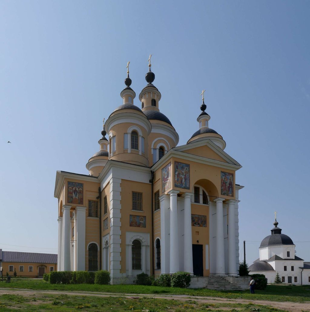 градостроительная характеристика здания, участвующего в формировании композиционного центра ансамбля монастыря, формирующего центральную ось его композиции и являющегося его высотной доминантой; центрическая объемно-пространственная композиция четырехстолпного крестово-купольного храма, складывающаяся из компактного кубического объема, с одинаковыми выступами (образующими крестообразный план), выдвинутыми на средних осях четырех фасадов, с портиками; пятью шлемовидными главками с крестами и небольшими яблоками в основании на цилиндрических световых барабанах; размеры, форма четырех угловых барабанов и более крупного среднего барабана, перекрытых куполами; размеры, форма пяти малых угловых барабанов-фонарей главок; скатная форма, габариты, угол наклона скатов крыши четверика; двухскатная форма, габариты, угол наклона скатов крыш выступов; местоположение, габариты, конфигурация дверных и оконных проемов здания: осевое расположение, прямоугольная форма дверных проемов главного и двух боковых входов в центре прямоугольных выступов западного, северного и южного фасадов; прямоугольная форма оконных проемов второго света северного, южного, восточного западного фасадов храма, в том числе с полукруглым возвышенным завершением первого света четверика и глухого окна алтарной части; осевое расположение и форма полуциркульных окон барабанов и арочных ложных проемов фонарей, крупных термальных окон второго света в средних интерколумниях портиков; материал (дерево) и характер заполнения дверных и оконных проемов; мелкая симметричная расстекловка оконных рам; оформление дверных проёмов северного, южного и западного входов ионическими пилястрами (по сторонам проемов), поддерживающими антаблемент с треугольным фронтоном (с сухариками); плоскими нишами над порталами; оформление оконных проемов наличниками, состоящими из архивольтов (с импостами), помещенных на прямоугольных накладках, и пилястр с перетяжками (по сторонам окон) основного объема; профилированные архивольты на импостах, обрамляющие верхние части проемов всех барабанов; прямоугольные в плане оконные ниши: вертикальные проемов первого света храма и горизонтальные окон барабанов; профильные подоконные карнизы;композиция и архитектурно-художественное оформление четырехколонных портиков северного, южного, восточного и западного фасадов тосканского ордера со спаренными колоннами по бокам, несущими антаблемент с широким фризом без архитрава и треугольные фронтоны; пилястры, расположенные на стенах в проекции колонн (угловые – огибающие); композиция и архитектурно-художественное оформление фасадов храма, включая: выделенный цоколь; муфтированные лопатки, фланкирующие углы основного объема; неполный антаблемент с гладким фризом по периметру четверика; прямоугольные ниши с фресками, вертикально размещенные во фризе антаблемента портика (над колоннами), и горизонтально между окнами первого и второго света храма, над входами трех фасадов и ложным окном алтаря; профилированные карнизы барабанов и завершения фонарей главок (в центральном фонаре на вытянутых кронштейнах); дугообразные тяги на консолях над верхними частями наличников среднего барабана; конструкции капитальных фундаментов; кирпичных стен; перекрытий (кирпичные сводчатые); материал 