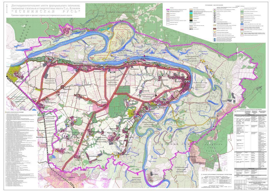 Предметом охраны, подлежащем сохранению при всех видах градостроительной, строительной и хозяйственной деятельности в границах достопримечательного места, связанного и жизнью и творчеством поэта С.А. Есенина, является исторически сложившийся культурный ландшафт с явно выраженной природной основой, формирующий образ «Есенинской Руси» – живописный сельский ландшафт средней полосы России с сохранившейся системой расселения и традиционным природопользованием. 1.1.Градостроительные характеристики 1.Историческая система расселения: - линейное размещение сёл и деревень Вакино, Федякино, Константиново, Кузьминское, Аксёново, Иванчино, Новосёлки, Окаёмово, Пощупово, Медведево, Ромоданово, Костино, Путково, Слобода, Подлуг, Бортное вдоль бровок береговых склонов Оки. - дисперсное размещение населённых пунктов Данилово, Кудашево, Кривоносово, Раменки, Чешуево, Шушпаново, Демидово, Старолетово, Летово, Романцево, Голенькино, Истобники, Шишкино, Ахмылово, Зубово, Марково, Волынь, Сидоровка, Елизаветинка, Аблово в долинах небольших рек и ручьёв. - размещение населённых пунктов заречной части на границе лугового ландшафта поймы Оки и лесных массивов.2.Сохранившиеся фрагменты мемориальных дорог: - участок трассы протяжённостью 1,5 км между д. Шушпаново и с. Федякино; - участок дороги Константиново – Раменки протяжённостью 1,5 км на выезде из Константиново; - дорога Константиново – Кузьминское – Аксёново – 7,5 км; - грунтовая дорога в пойме р. Оки от переправы в Пощупово в Солотчу – 9,0 км; - дорога Константиново – место бывшего размещения парома – Константиновские луга – бывший хутор Яр.3.Исторические паромные переправы в Кузьминском, Пощупово и Новосёлках.4.Расположение исторических доминант как панорамных ориентиров церквей в Вакино, Константиново, Новосёлках, Пощупово и Костино.5.Исторические названия населённых пунктов и их частей. 1.2.Ландшафтные характеристики 1. Гидрографическая сеть – р. Ока и р. Вожа с впадающими в них небольшими реками и ручьями, а также озёра, пруды, старицы.2.Типы ландшафта бассейна визуальных раскрытий: - полевой ландшафт от берегового склона до линии Старолетово – Раменки – Пощупово: поля, овражно-балочная сеть;- лесостепной ландшафт от линии Старолетово – Раменки – Пощупово в южном направлении: поля, овражно-балочная сеть, лесные массивы различных размеров;- ландшафт береговых склонов от с. Вакино до д. Бортное: овраги, холмы, бугры, гребни. Константиновское подгорье с буграми (\"Минаков\", \"Барский\", \"Калинкин\", \"Поповский\", \"Средний\"), \"Табашной\" горой, оврагами (\"Пасик\", \"Потеряевский\", \"Большой\", \"Матовский\", \"Барак\"), а также \"Федякинский\" овраг;- луговой ландшафт пойменной части бассейна р. Оки, экранируемый кромками лесных массивов заречья и береговыми склонами правобережья. Константиновское заречье с озерами «Тишай» и «Глубокое», Константиновские луга (Первая пожень, Вилы, Любянки, Долгое, Широкий низ, Белоборка, Коноплянки, Дальняя коса, Делянки, Журавка, Баронская, Тёщин язык, Ленточка, Шорошенькая, Лохово, Кукариха, Енотово болото, Сапог, Стрелица, Барские луга, Ближняя коса, Дальняя коса), а также Высокий бугор и «Макаров угол»; - лесные массивы в районе д. Иванчино, южнее с. Костино, Федякинский лес (ООПТ), лес \"Пощупово\" (ООПТ), \"Раменская роща\", колковые леса овражно-балочной сети, парки усадьбы Кашиной, 