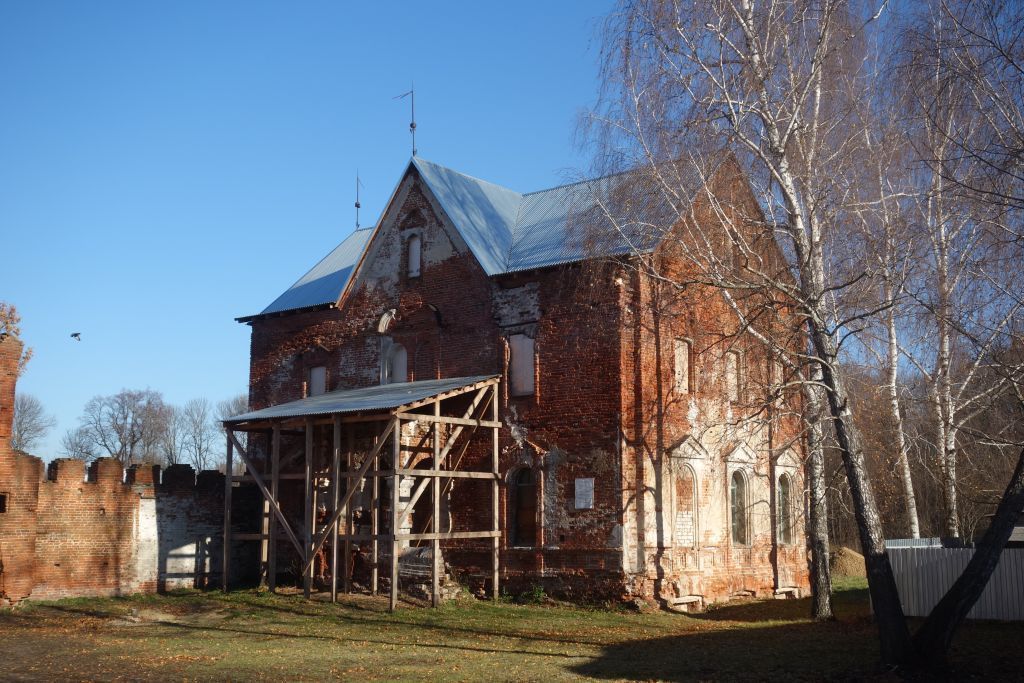 Утвержден приказом государственной инспекции по охране объектов культурного наследия Рязанской области от 15.04.2016 г. № 55.I. Комплекс усадьбы: 1. Композиционно-пространственные характеристики:1.1. Местоположение и градостроительные характеристики усадьбы, расположенной в восточной части села. 1.2. Пространственно-планировочная структура усадебного комплекса, разделенного в планировочном отношении на две основные части: - западную, с зелеными насаждениями в её северной части и комплексом «красного двора», приближенного к юго-западной части усадьбы, сформированным двумя парными двухэтажными зданиями (флигелями), и, соединяющими их и довершающими образование двора зубчатыми стенами, над которыми возвышаются высокая угловая башня (в юго-западном углу) и ворота (в северной части);- восточную, где устроен пейзажный парк.2. Объёмно-пространственные характеристики: 2.1. Силуэт усадебного комплекса (включая габариты, высотные и силуэтные характеристики зданий) и окружающей застройки, формирующие планировочную структуру села;2.2. Объёмно-пространственные характеристики территории комплекса – система открытых, полузакрытых, закрытых пространств территории (поляны, кусты, ценные насаждения, ряды, высокие деревья).3. Композиционно-пространственная структура усадебного комплекса: 3.1. Композиционные особенности комплекса, выраженные тектоническими особенностями и зрительным восприятием: мощные объемы зданий, господствующие над окружающей застройкой, и соединяющая их стена образуют четкую симметричную композицию, а высокая угловая башня придает ансамблю вертикаль.3.1.1. Архитектурные характеристики (архитектурно-стилевые решения, основные строительные и отделочные материалы) объектов культурного наследия (памятников истории и культуры), входящих в состав усадебного комплекса:Дом, XVIII в. (восточный флигель).Градостроительная характеристика здания, расположенного на территории усадьбы, в его юго-западной части, в северо-восточном углу «красного двора»;объемно-пространственная композиция прямоугольного в плане, немного вытянутого в направлении север-юг, двухэтажного с подвалом сооружения, перекрытого многощипцовой кровлей над высокими щипцовыми фронтонами (щипцы на протяженных фасадах поднимаются над средними частями фасада, на торцевых – от полиц); габариты и высотные отметки по коньку крыши;местоположение, габариты, конфигурация и оформление дверных и оконных проемов здания: все оконные проемы заключены в прямоугольные кирпичные наличники; окна подвала и второго этажа с пологими лучковыми перемычками, первого этажа и два средних на втором – арочные; наличники окон первого этажа завершены треугольными фронтонами, в тимпанах - круглые розетки; наличники окон второго этажа опираются на подоконную тягу с консолями, увенчаны треугольными разорванными фронтонами. На торцевых фасадах наличники средних окон крупнее других. На протяженных фасадах два средних проема сближены и объединены между собой единым наличником с полукруглым разорванным фронтоном над ним, в центре поля наличника (между проемами, на уровне их завершений) помещены круглые штукатурные филенки. Щипцы прорезаны небольшими арочными окнами в наличниках, подобных большинству на втором этаже. композиция и архитектурно-художественное оформление фасадов: фасад