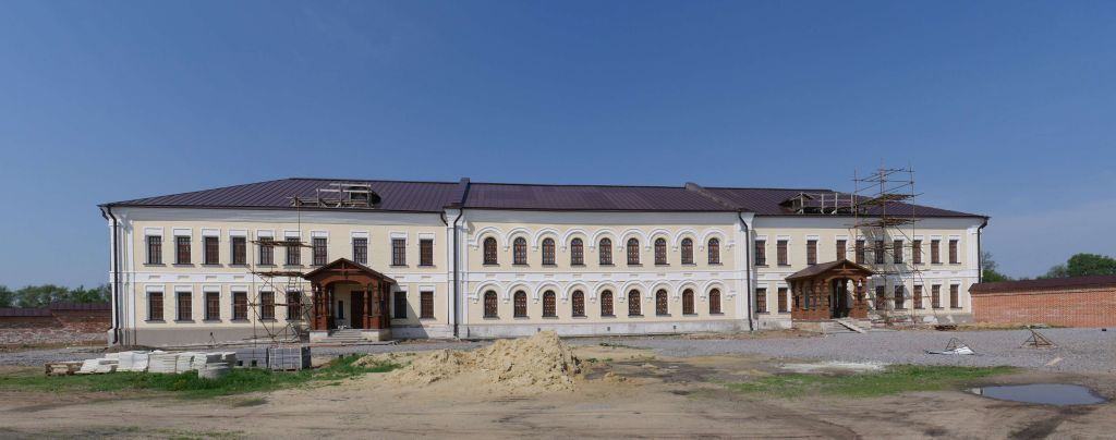 градостроительная характеристика здания, закрепляющего западную границу ансамбля монастыря;объёмно-пространственная композиция прямоугольного в плане двухэтажного протяженного объема, разделенного на северную, центральную и южную части брандмауэрными стенами; с ризалитом в девять осей в центре восточного (главного) фасада; крыльцами на третьих правых осях северной и южной частей восточного фасада; вальмовая форма, габариты, угол наклона скатов, высотные отметки по коньку крыши;местоположение, габариты, конфигурация дверных и оконных проемов здания: осевое расположение, прямоугольная форма проемов, восточного, западного, северного и южного фасадов, в том числе полуциркульных окон ризалита; полукруглая форма небольших слуховых окон восточного и западного скатов крайних частей крыши; материал (дерево) и характер заполнения дверных и оконных проемов; мелкая витражная и радиальная расстекловка оконных рам;композиция и архитектурно-художественное оформление фасадов, включая: выступающий цоколь и межэтажный пояс, отмеченный рядом подоконных ширинок, по периметру объема; П-образные сандрики оконных проемов боковых частей объема восточного, южного, северного фасадов и всех окон западного фасада; надоконные пояса ризалита, состоящие из профилированных архивольтов на импостах; подоконные карнизы; угловые пилястры прямоугольного объема и ризалита; пилястры, делящие южный, северный и западный фасады на три части; лопатки западного фасада, и узкие лопатки, дополняющие пилястры восточного фасада; многопрофилированный завершающий карниз; конструкции капитальных фундаментов; кирпичных стен; перекрытий (плоские и сводчатые подвала); материал и техника кладки капитальных стен: красный кирпич; материал кровли: листовой металл; материал крылец: дерево; характер обработки фасадной поверхности здания: обработанные поверхности наружных стен известковой обмазкой; историческая пространственно-планировочная структура и элементы отделки интерьера: в пределах капитальных стен, опорных конструкций, дверных и оконных проемов, перекрытий. Предмет охраны может быть дополнен в процессе проведения научно-исследовательских работ в рамках сохранения объекта культурного наследия.
