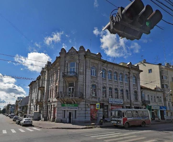 Объёмно-пространственная композиция объекта культурного наследия: - здание трехэтажное, кирпичное, П-образное в плане, со скошенным углом, ризалитами, проездной аркой,- конфигурация, габариты в плане и по высоте (включая высотные отметки крыши) здания.Строительные конструкции здания:- фундамент,- наружные и внутренние капитальные стены. Композиционное построение и архитектурное оформление главных фасадов:- внешний архитектурный облик здания решен в стиле модерн,- характер фасадной поверхности – стены здания оштукатуренные, окрашенные, - количество, осевое расположение, конфигурация оконных проемов основного ряда:в уровне первого этажа – проемы витринные прямоугольные, в уровне второго этажа – проемы с полуциркульной перемычкой, с сандриком, замковым камнем, в уровне третьего этажа – проемы с полуциркульной перемычкой, сандриком, профильным подоконным карнизом, подоконной филенкой,- ширинки овальной формы между первым и вторым этажами, - междуэтажный карнизный пояс, раскрепованный в месте нахождения овальной ширинки,- венчающий карнизный пояс с кронштейнами,- ризалит с парадным входом со стороны скошенного угла: проем входа полуциркульного завершения, балконная плита в виде раковины на спаренных консолях,балкон второго этажа на консолях,пилястры рустованные,венчающий карниз сложного профиля с лепным декором в виде маски и растительного орнамента,парапетные столбики, фигурная аттиковая стенка,- ризалит со стороны улицы Ленинская:пилястры широкие рустованные, две плиты с декором в виде маски, с фигурным обрамлением, два парадных входа, балконные плиты в виде раковин на консолях,венчающий карниз сложного профиля с лепным декором в виде маски и растительного орнамента,парапетные столбики, фигурная аттиковая стенка,- ризалиты со стороны улиц Ленинская и Льва Толстого:пилястры - рустованные в уровне первого этажа, выше - шнуры,декоративное оформление оконных проемов: в уровне первого этажа – прямоугольные (один с арочным перекрытием, наличником), в уровне второго этажа - брамантово окно, в уровне третьего этажа - с полуциркульной перемычкой, с сандриком, замковым камнем,парапетные столбики, фигурные аттиковые стенки.