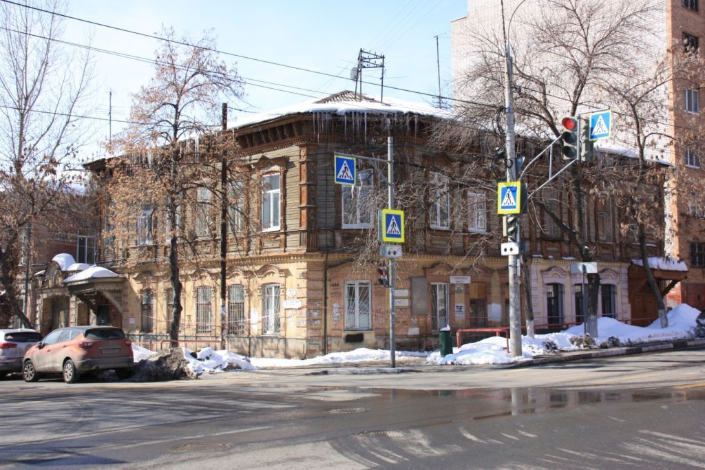 Объёмно-пространственная композиция объекта культурного наследия:- здание двухэтажное с подвальным этажом, полукаменное, прямоугольное в плане, со скошенным углом, - конфигурация, габариты в плане и по высоте (включая высотные отметки крыши) здания,Композиционное построение и декор фасадов- внешний архитектурный облик здания решен в стиле эклектики,главный фасад по улице Некрасовская – 7-осевая фронтальная композиция,главный фасад по улице Садовая – 6-осевая фронтальная композиция,- стены: в уровне первого этажа - из красного керамического кирпича, оштукатурены, в уровне второго этажа - из дерева, обшиты тесом,- скошенный угол: в уровне первого этажа – руст, в уровне второго этажа - по углам деревянные лопатки с накладными деталями пропильной резьбы,- оконные проемы: в уровне первого этажа - небольшие прямоугольные, с наличниками, криволинейным сандриком и геометрическими деталями из фигурного кирпича; в уровне второго этажа - с лучковой перемычкой, деревянными наличниками с треугольной бровкой, накладными геометрическими деталями и ажурной пропильной резьбой,- подоконный карнизный пояс с накладными деревянными деталями геометрических форм,- дверной проем парадного входа раскрыт в левой части фасада по улице Садовая - козырек на кронштейнах, пропильная резьба,- карнизный пояс с сухариками, ажурными кронштейнами пропильной резьбы, круглыми накладными деталями в виде цветков.