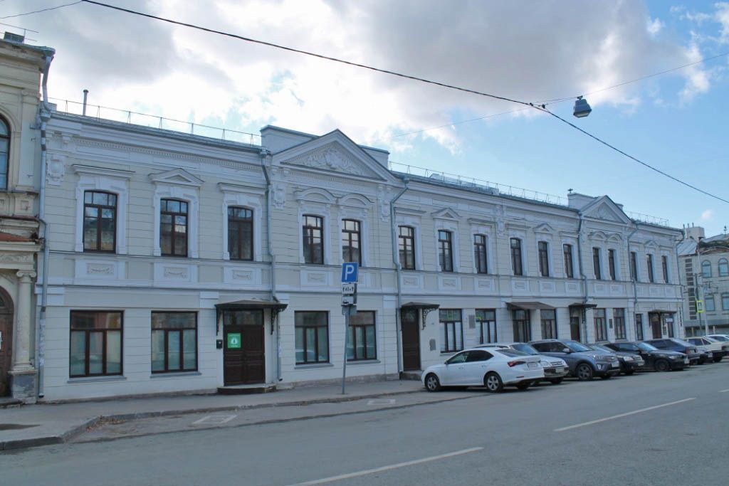 Объёмно-пространственная композиция объекта культурного наследия: - здание двухэтажное, с подвалом, кирпичное, Г-образной формы в плане, с ризалитами,- конфигурация, габариты в плане и по высоте (включая высотные отметки крыши) здания.Строительные конструкции здания:- фундамент,- наружные и внутренние капитальные стены,- местоположение лестниц.Композиционное построение и декор фасадов:- внешний архитектурный облик здания решен в стиле неоренессанс,- характер фасадной поверхности – стены выполнены из керамического красного кирпича, оштукатурены, окрашены. Простенки между оконными проемами рустованы,- количество, осевое расположение, конфигурация, вид материала и рисунок оконных и дверных проемов:в уровне первого этажа – проемы широкие с прямой перемычкой, четырехстворчатой фрамугой,в уровне второго этажа - проемы с лучковой перемычкой, наличниками, замковым камнем; часть проемов с прямыми сандриками, часть с сандриками с треугольными фронтонами,в ризалитах - проемы с наличниками, лучковыми сандриками,- подоконный карнизный пояс с нишами-ширинками, - ризалиты: пояс из меандров на фризе, треугольные фронтоны с лепниной растительного орнамента, картуш с рольверками и инициалом владельца «С» (Санина И.Л.) в центре фронтонов, парапетные стенки,- пилястры с парой кронштейнов, акантами и картушем с рольверком,- фриз с поясом геометрического декора,- венчающий карнизный пояс с сухариками. Интерьеры объекта культурного наследия:- потолок в помещениях второго этажа литеры А – падуги.