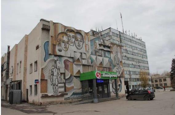 Произведение монументального искусства - мозаичное панно «Строители», расположенное на фасаде здания строительного Треста № 25. Художники-монументалисты: Б.А.Кураго, Г.В.Суздальцева, Н.В.Пашкова, В.С.Ларионова