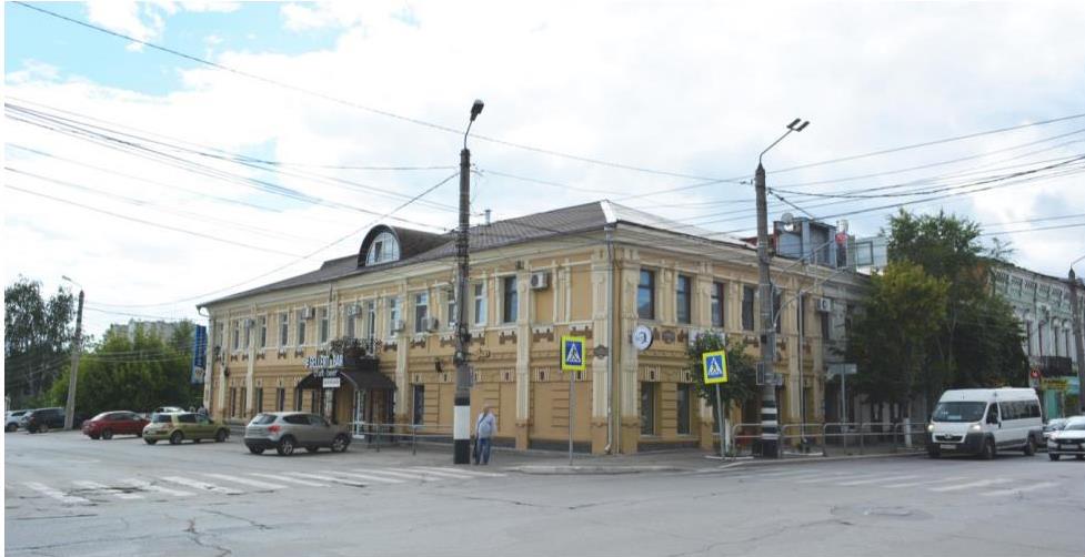 Градостроительные характеристики - угловое расположение на пересечении улиц Советской и Степана Разина. Композиционная значимость - является частью фронта репрезентативной застройки ул. Советской.Габариты, силуэт - объемно-планировочное решение: двухэтажное, кирпичное, Г-образное в плане здание. Секторы и направления видовых раскрытий, визуальные связи памятника - точки восприятия памятника с улиц Советская и Степана Разина.Объемно-пространственная композиция - первоначальные форма, габариты и характеристики здания, сложившиеся в ходе его строительства и последующей эксплуатации. Композиция и архитектурно-художественное оформление фасадов на дату строительства - композиционное построение и внешнее декоративное оформление здания в стиле модерн: расположение и конфигурация проёмов по фасадам; декор проемов первого этажа в виде замковых камней, рустовка стен главных фасадов в уровне первого этажа; профилированные наличники оконных проёмов второго этажа с прямыми сандриками с орнаментом из иоников, полочки с декоративной доской с гуттами в подоконном пространстве с рельефной фактурой – штукатуркой под шубу; пилястры с каннелюрами и розетками; парные триглифы; балкон с фигурным металлическим ограждением по второму этажу в центральной части фасада по ул. Степана Разина; межэтажные карнизы с круглыми розетками; широкий профилированный венчающий карниз с дентикулами; аттиковые стенки с оконными проёмами в центральной части главных фасадов, оконный проём с полуциркульной перемычкой и замковым камнем по ул. Степана Разина.