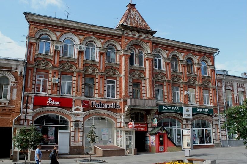 Объёмно-пространственная композиция объекта культурного наследия: - здание трехэтажное с подвалом, кирпичное, П-образной формы в плане, ризалитом с аркой проезда и антресольным этажом,- конфигурация, габариты в плане и по высоте (включая высотные отметки крыши) здания.Строительные конструкции здания:- фундамент,- наружные и внутренние капитальные стены,- своды Монье в арке проезда. Композиционное построение и декор фасадов:главный фасад:- внешний архитектурный облик здания решен в русском стиле,- характер фасадной поверхности - стены выполнены из красного керамического кирпича под расшивку, не оштукатурены, - количество, осевое расположение, конфигурация, заполнение оконных проемов:в уровне первого этажа – окна-витрины с арочными перемычками, деревянным витражом,в уровне второго этажа – проемы прямоугольные, с сандриками в виде пары висячих арочек с гирькой и треугольной бровкой, в уровне третьего этажа – проемы с полуциркульными арочными перемычками, профилированными архивольтами, поясами сухариков в оформлении арочных перемычек,в уровне антресольного этажа - окно-люкарна с полуциркульной арочной перемычкой,- рустованные лопатки с вертикальными ширинками,- арка проезда с полуциркульной арочной перемычкой,- лоджия в ризалите, - два массивных пилонами с четвертными колоннами по углам, широкая полуциркульная арка с массивным архивольтом,- балкон на двух кирпичных кронштейнах,- четырехгранный шатер с полицей и шпилем,- венчающий карнизный пояс ступенчатый, с рядом поребрика, по центру - с полуциркульными арками,дворовый фасад:- количество, осевое расположение, конфигурация и заполнения оконных проемов: проемы с клинчатыми лучковыми перемычками, наличниками.Интерьеры объекта культурного наследия:- металлическое ограждение лестницы.