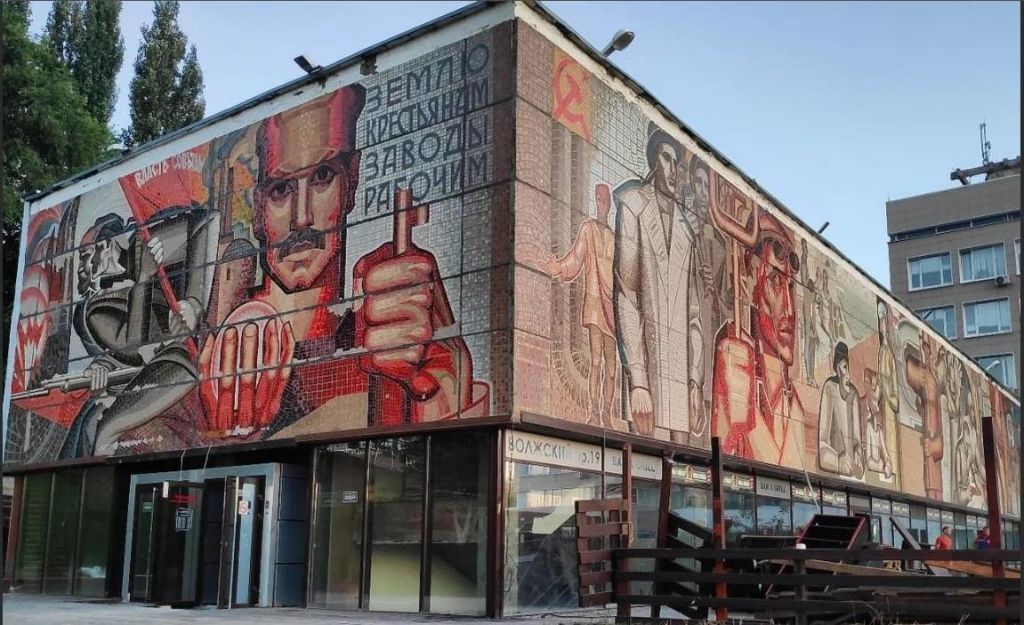 Произведение монументального искусства - мозаичное панно художника В.Д.Герасимова: «Революция» и «Социалистическое строительство», расположенное на фасадах здания «Дом профсоюзов»