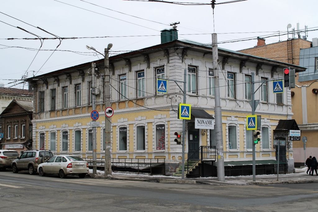 Объёмно-пространственная композиция объекта культурного наследия: - здание двухэтажное, с подвалом, смешанных конструкций, прямоугольное в плане,- конфигурация, габариты в плане и по высоте (включая высотные отметки крыши) здания.Строительные конструкции здания:- фундамент,- наружные и внутренние капитальные стены. Композиционное построение и декор главных и бокового фасадов:Главные фасады:- внешний архитектурный облик здания решен в стиле эклектики,- характер фасадной поверхности – деревянные стены первого и второго этажей обложены снаружи кирпичом, не оштукатурены, окрашены по кирпичу,- количество, осевое расположение, конфигурация оконных проемов:в уровне первого этажа – проемы с лучковой перемычкой, кирпичными наличниками с имитацией рустованной каменной кладки,в уровне второго этажа - проемы прямоугольные, с прямой клинчатой перемычкой, рамочными кирпичными наличниками с замковым камнем, - дверной проем парадного входа с лучковой перемычкой,- подоконный парапет с нишами,- руст на углах здания, - межэтажный карнизный пояс,- венчающий карнизный пояс с широким выносом на фигурных деревянных кронштейнах.Боковой фасад:- количество, осевое расположение, конфигурация оконных проемов:в уровне первого этажа - проемы с клинчатой перемычкой,в уровне второго этажа - проемы с деревянными наличниками, замковым камнем; первоначальное столярное заполнение – двустворчатые с фрамугой,- венчающий карниз с широким выносом на фигурных деревянных кронштейнах,- слуховые окна на крыше.