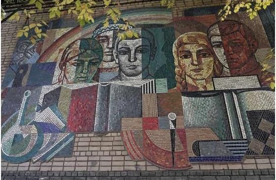 - основа монументальной живописи – северный фасад двухэтажных пристроев к четырехэтажному зданию учебно-производственного комбината,- местоположение мозаичных панно на фасаде пристроев к основному четырехэтажному объему здания со стороны улицы Антонова Овсеенко,- секторы и направления видовых раскрытий, визуальные связи объекта - точки восприятия объекта с улицы Антонова-Овсеенко, - техника монументальной живописи - мозаика, - материал - цветная смальта,- фактура и колористическое решение мозаичной поверхности в красно-сине-желто-белой гамме с включением мозаики изумрудно-зеленого цвета,- функция - экстерьерная монументальная живопись,- композиция мозаичного панно, состоящая из двух тематических циклов: 1) Молодежь в науке (на восточном пристрое) – композиция из шести женских и мужских лиц разных национальностей преимущественно в анфас, а также в профиль, символика научной деятельности – раскрытые книги, колба, циркуль с транспортиром, шахматная доска и др., 2) Молодежь на производстве (на западном пристрое) – композиция из четырех женских и мужских лиц преимущественно в анфас, а также в профиль, символика легкой промышленности – хлеб, обувь, одежда, швейная машинка, одежда, обувь, циферблат торговых весов, телефонная трубка, фрагмент микроавтобуса и логотип службы быта.