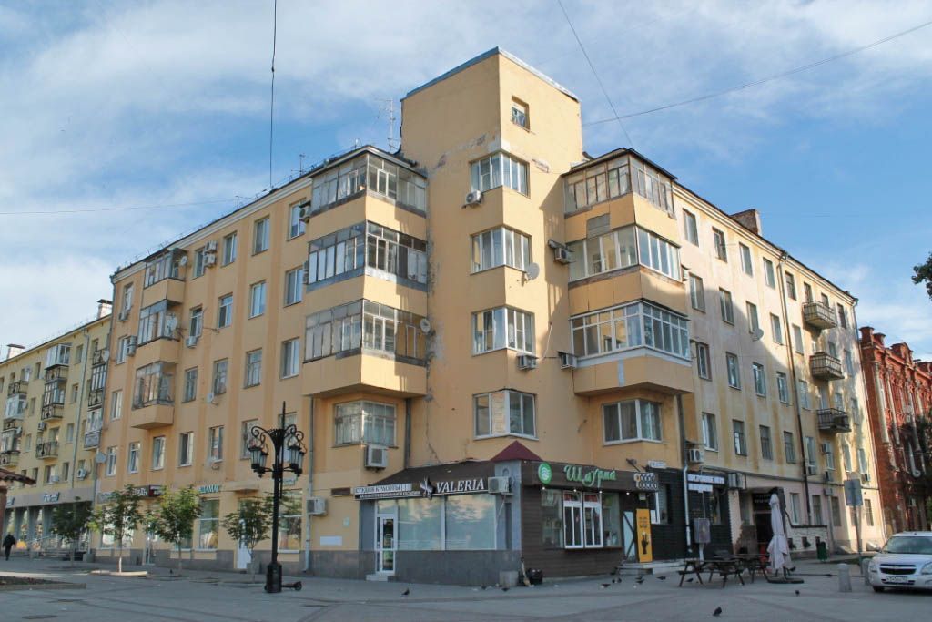 Объёмно-пространственная композиция объекта культурного наследия: - здание пятиэтажное, кирпичное, Г-образное. - конфигурация, габариты в плане и по высоте (включая высотные отметки крыши) здания - угловой блок отступает от красной линии. Часть здания, расположенная на пересечении улиц и отступающая от красной линии, поднята на высоту этажа относительного всего объема здания.Строительные конструкции здания:- фундамент,- наружные и внутренние капитальные стены. Композиционное построение:- внешний архитектурный облик здания решен в стиле конструктивизма,- характер фасадной поверхности – стены выполнены из кирпича, оштукатурены. Фасады здания окрашены с вертикальными полосами более темного тона между окнами, имитирующими лопатки,- количество, осевое расположение, конфигурация оконных проемов,- структурное металлическое ограждение балконов.