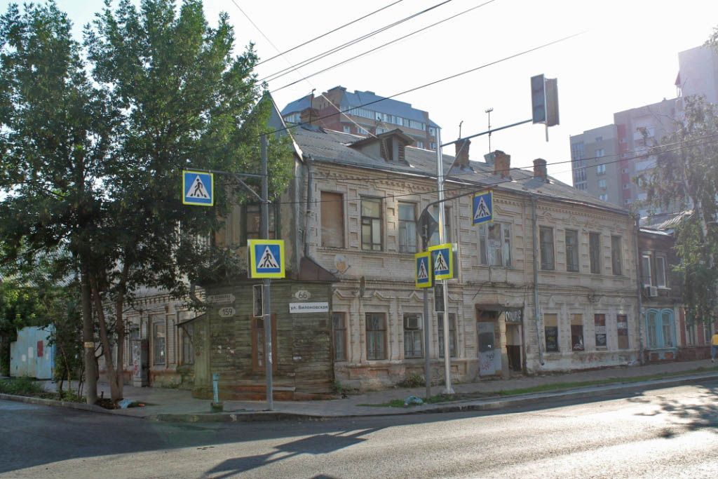 Объёмно-пространственная композиция объекта культурного наследия: - здание двухэтажное, сложное в плане,- конфигурация, габариты в плане и по высоте (включая высотные отметки крыши) здания.Строительные конструкции здания:- фундамент,- наружные и внутренние капитальные стены,- эркер с шатром в угловой части (утрачен, требуется воссоздание). Композиционное построение и главных фасадов:- внешний архитектурный облик здания решен в стиле кирпичной эклектики,- характер фасадной поверхности – стены выполнены из кирпича, не оштукатурены,фасад по улице Вилоновская:- пилястры рустованные,- количество, осевое расположение, конфигурация, материал и рисунок заполнений оконных проемов:в уровне первого этажа – проемы прямоугольные, с наличниками, сандриками с треугольной бровкой и полуколоннами. Под проемами ниши-ширинки,в уровне второго этажа - проемы прямоугольные, с наличниками, сандриками с полуциркульной бровкой. Центральный проем - широкий, с наличником, сандриком с полуциркульной бровкой (ранее на месте оконного проема был балкон – дверной проем заложен до уровня окна). Под проемами ниши-ширинки,- междуэтажный карнизный пояс с поребриком,- венчающий карнизный пояс с сухариками,фасад по улице Ленинская:- количество, осевое расположение, конфигурация, материал и рисунок заполнений оконных проемов: проемы прямоугольные, с наличниками и прямыми сандриками. Под проемами ниши-ширинки,- пилястры между оконными проемами,- междуэтажный карнизный пояс с сухариками.