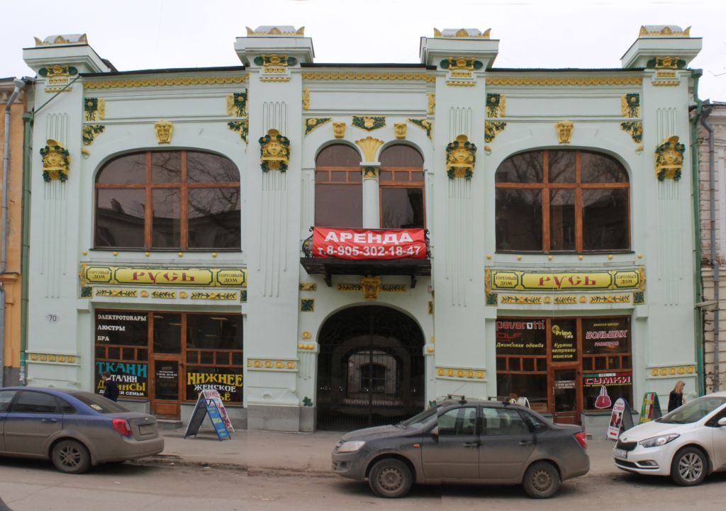 Объёмно-пространственная композиция объекта культурного наследия: - двухэтажное с подвалом здание,- парадная центральная арка проезда раскрывается на главном фасаде в восьмигранный внутренний двор, центральная арка напротив – во второй прямоугольный с закругленными углами внутренний двор; следующая арка, в левом углу – в третий незамкнутый внутренний двор,- конфигурация, габариты в плане и по высоте (включая высотные отметки крыши) здания.Строительные конструкции здания: - подвальный этаж на всю длину здания перекрыт системой кирпичных сводов, опирающихся на наружные несущие стены по периметру и кирпичные столбы в центре,- стены выполнены из красного керамического кирпича.Композиционное построение и декор главного фасада:- главный фасад имеет трехосевую симметричную фронтальную композицию,- четыре широких пилона поднимаются над линией венчающего карниза. Нижняя часть пилонов над стилобатом имеет пластичную криволинейную форму, над ней пояс с пятью керамическими барельефами-пальметтами. Ствол пилонов декорирован пятью узкими длинными вертикальными шнурами, в уровне второго этажа - горельефные женские маски. Маски увенчаны коронами в виде морских раковин, с расходящимися волнами распущенных волос, в которые вплетены листья и цветы кувшинок. Капители пилонов с полоской бус и барельефом с орнаментом из морской раковины в фигурной раме с четырьмя мелкими листьями кувшинок и двумя крупными по бокам. На абаке капителей, возвышающихся над венчающим карнизом, - зубчатые короны с растительным орнаментом,- прямоугольные окна-витрины на первом этаже, широкие окна криволинейного очертания и центральный полуциркульный балконный проем-бифорий на втором этаже. Витрины первого этажа с трехчастным членением по горизонтали, в середине - входы в торговые залы. Окна второго этажа коробового очертания с плоским наличником с пластичным завершением и завитками по краям. На месте замкового камня - акантовый кронштейн с волютами, по бокам – барельефы с композицией из стеблей, листьев и цветков кувшинок. Оконные заполнения – трехчастные, продолжающие рисунок витрин первого этажа,- эллиптическая арка проезда с тремя узкими вертикальными шнурами, бусами, пальметтами, квадратными барельефами с растительным орнаментом по бокам; на месте замкового камня - акантовый кронштейн с волютами. - балкон с ажурным кованым ограждением. Выход на балкон раскрыт в правой части бифория. По бокам три узких вертикальных шнура и полукруглая пилястра в центре. Капитель пилона в виде композиции из акантовых листьев с завитками. Над абакой пилястры – барельеф в виде стилизованного цветка лилии. На месте замковых камней по центру полукруглых проемов – акантовые кронштейны с волютами. Три барельефа с переплетенными мелкими листьями; в центральном – картуш с буквой «П», инициал владельцев Торгового дома Пермяковых, в правом – на круглом диске весы, в левом – змея, спиралью обвивающая крылатый меч,- прямоугольные профилированные рамки,- венчающий карниз с поясом из цветных керамических круглых барельефов в виде пальметт.