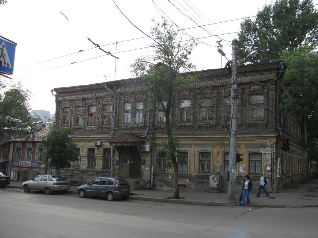 Здание литера Б:Объёмно-пространственная композиция объекта культурного наследия: - здание двухэтажное, полукаменное, Г-образное в плане, с ризалитом,- конфигурация, габариты в плане и по высоте (включая высотные отметки крыши) здания.Строительные конструкции здания:- фундамент,- наружные и внутренние капитальные стены. Композиционное построение и декор фасадов:- внешний архитектурный облик здания решен в традициях строительства деревянных домов «под камень» с чертами эклектики и русского стиля,- характер фасадной поверхности – первый этаж выполнен из кирпича, оштукатурен и окрашен, второй - снаружи обшит тёсом в вертикальном и горизонтальном направлении,- количество, осевое расположение, конфигурация, заполнение оконных проемов:в уровне первого этажа – проёмы с лучковой перемычкой, прямыми сандриками, сухариками. В подоконном пространстве прямоугольные ниши-ширинки,со стороны улицы Самарская с левой стороны от входа оконные проёмы с лучковой перемычкой, объединены тянутым карнизом, в простенках - ниши–ширинки. Тянутый подоконный карниз, прямоугольные призматические элементы, ширинки,в уровне второго этажа - проемы с лучковой перемычкой, наличниками, трехчастными сандриками с треугольной бровкой, богатым резным пропильным декором. Боковые наличники в верхней части с объёмными резными деталями. Подоконная доска с ажурным резным подзором,- парадный вход в ризалите со стороны улицы Красноармейская - проём прямоугольной формы с двустворчатым столярным заполнением,- парадный вход со стороны улицы Самарская - проём прямоугольной формы с двумя одностворчатыми металлическими дверями, навес с вальмовой трёхскатной кровлей. Козырёк деревянный, с резными пропильными подзорами, на деревянных резных кронштейнах. Ко входу ведёт кирпичное крыльцо,- пилястры рустованные в уровне первого этажа, лопатки деревянные с накладным резным декором в уровне второго этажа,- междуэтажный карнизный пояс с двумя рядами сухариков: крупные зубцы - по ризалиту и пилястрам, более мелкие по всей плоскости главных фасадов. Ряд маленьких кронштейнов со стороны главного фасада по лице Самарская,- фриз с рельефным узором геометрического характера,- венчающий карниз простого профиля с двухрядным резным подзором и ажурными пропильными накладными деталями. Дворовые фасады: - количество, осевое расположение, конфигурация заполнения оконных проемов: проемы с лучковой перемычкой, наличниками, трехчастными сандриками с треугольной бровкой, резным пропильным декором. Боковые наличники в верхней части с объёмными резными деталями. Подоконная доска с ажурным резным подзором.Здание литера АОбъёмно-пространственная композиция объекта культурного наследия: - здание двухэтажное, полукаменное, прямоугольное в плане,- конфигурация, габариты в плане и по высоте (включая высотные отметки крыши) здания.Строительные конструкции здания:- фундамент,- наружные и внутренние капитальные стены. Композиционное построение и декор фасадов:- внешний архитектурный облик здания решен в традициях строительства деревянных домов «под камень» с чертами эклектики и русского стиля,- характер фасадной поверхности – первый этаж выполнен из кирпича, оштукатурен и окрашен, второй - снаружи обшит тёсом в горизонтальном направлении,- количество, осевое расположение, конфигура