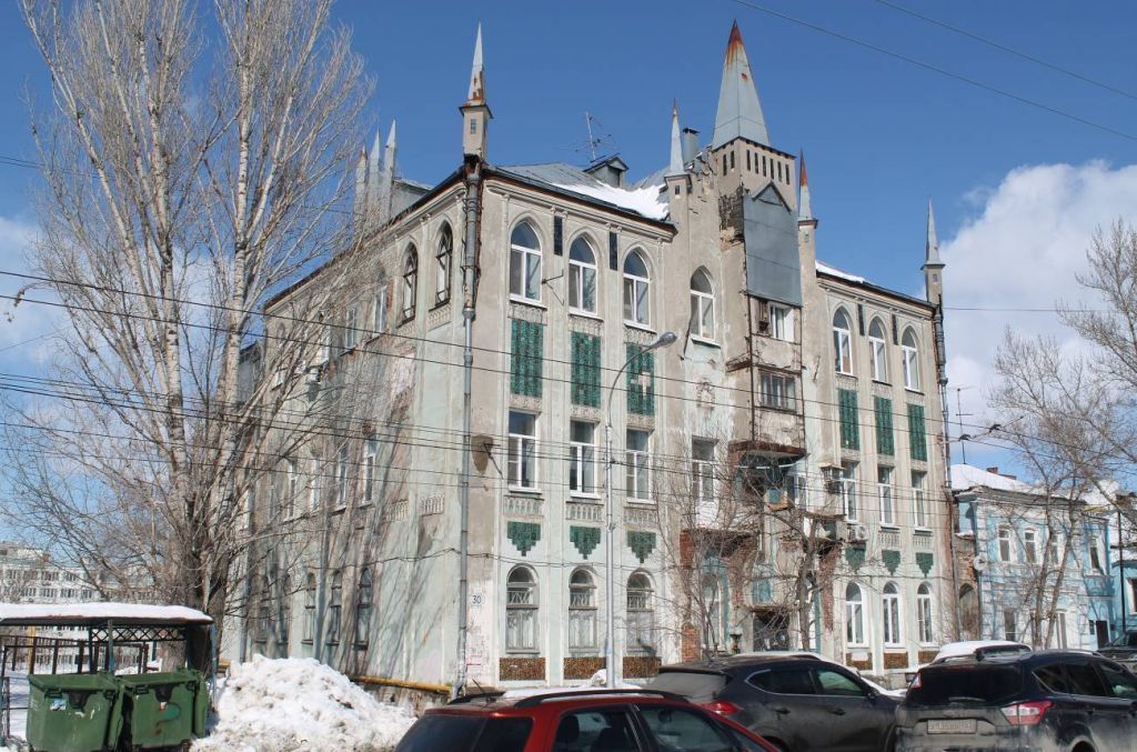 Объёмно-пространственная композиция объекта культурного наследия:- здание кирпичное, с полуподвалом, Г-образное в плане, переменной этажности (Рис. 1, фото 1,2): литера А – здание трехэтажное со стороны улицы и четырехэтажное со двора; литеры А1,А2,А3,С14 - дворовая часть; центральный четырехгранный шатер и 10 пинаклей со шпилями: 4 больших на главном фасаде (фото 3-6) и по 3 на боковых фасадах (фото 7); литера а - проходная арка.Строительные конструкции здания:- бутовые ленточные фундаменты, наружные и внутренние капитальные стены, перекрытия плоские по деревянным балкам, 4 двухмаршевые бетонные лестницы (фото 19, 20, 25, 29).Композиционное построение и декор фасадов:- архитектурно-художественное решение фасадов в стиле модерн с элементами готики; - вид материала и характер фасадной поверхности; - первоначальная облицовка глазурованными керамическими плитками (фото 10, 11, 12, 13); - количество, осевое расположение и конфигурация оконных и дверных проёмов по фасадам; исторический вид материала и рисунок дверных и оконных заполнений (фото 8, 9, 14, 15, 16, 17); - декоративное оформление главного и боковых фасадов, включая эркер на кронштейнах, заканчивающийся рядом узких окошек бойниц и увенчанный четырехгранным шатром в уровне кровли (фото 1, 3, 6); балконы с ограждением на кронштейнах, начинающихся от земли и смыкающихся под балконом в виде стрельчатой арки, лепные розетки в простенках с женскими фигурами в ниспадающих одеждах, в обрамлении венка из цветов (фото 8, 9), вставки керамических плиток (фото 3-5, 8-13), аттиковая стенка (фото 6), венчающий карниз (фото 8, 13).Декоративно-художественная отделка интерьеров здания.- подлинные элементы оформления интерьеров, включая цветные витражи (фото 26, 27), керамическую плитку на полах в помещении вестибюля 1-го этажа и лестничных площадок (фото 18, 21, 23, 27), выколотной декор на лестничных маршах (фото 22-25, 27, 29).