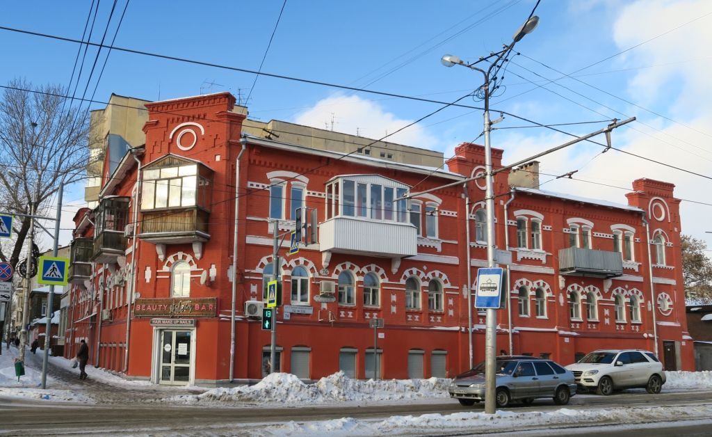 Объёмно-пространственная композиция объекта культурного наследия: - здание трехэтажное с подвальным этажом, кирпичное, Г-образное со скошенным углом в плане, с ризалитами,- конфигурация, габариты в плане и по высоте (включая высотные отметки крыши) здания.Строительные конструкции здания:- фундамент,- наружные и внутренние капитальные стены. Композиционное построение и декор фасадов:- внешний архитектурный облик здания решен в стиле неоготика,главные фасады:- характер фасадной поверхности - стены выполнены из красного керамического кирпича, не оштукатурены,- количество, осевое расположение и конфигурация оконных проемов по фасадам:в уровне первого этажа – проемы с клинчатой перемычкой,в уровне второго этажа – проемы полуциркульные с замковыми камнями, в подоконных нишах с кирпичным декором в виде крестов, в уровне третьего этажа – проемы основного ряда с лучковой перемычкой, узкие спаренные, с единым лучковым наличником, ряды сухариков под оконными проемами,в ризалитах – проемы арочной формы, с замковым камнем, - балконы в уровне третьего этажа на крупных кронштейнах,- широкие лопатки с ширинками,- стрельчатый фронтон-вимперг с окном-люкарной, завершающий центральную часть главного фасада по улицы Льва Толстого,- высокие парапетные стенки с окнами-люкарнами,- фриз с рядом дентикул.дворовые фасады:- декоративные ниши с элементами в виде крестов, - оконные проемы: в уровне первого этажа – проемы с клинчатой перемычкой, в уровне второго этажа полуциркульной формы, в уровне третьего этажа – с клинчатой перемычкой.