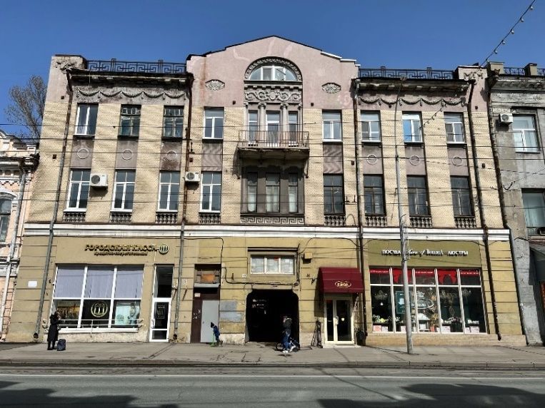1.Местоположение Объекта в структуре города: по красной линии застройки ул. Московская2. Габариты, объемно-планировочная композиция и конструктивное решение здания: •этажность (трех-, четырех-этажное);•форма в плане (карэ)•крыша здания, её конструкция, конфигурация, материал, характер кровельного покрытия; •местоположение наружных и внутренних несущих стен;•местоположение и габариты лестниц.2.1.Главный уличный фасад:- с большими витринными окнами и центрально расположенной проездной аркой;- на 5 (по первому этажу), 11 (по второму и третьему этажам) световых осей.3. Материал стен: - кирпичная кладка (глиняный кирпич на известковом растворе); - штукатурка;- облицовка глазурованной керамической плиткой.4.Композиционное и архитектурно-художественное оформлениефасадов:- центрально-симметричная композиция;- стилевое решение фасадов (неоклассицизм);- рустовка первого этажа;- габариты и профиль межэтажного карниза в уровне 1 этажа;- облицовка второго и 3-го этажей;- подоконная балюстрада в уровне 2-го этажа;- лепнина над окнами 2-го этажа;- балкон в уровне 3-го этажа;- гирлянда на фризе;- розетка в виде цветка;- продухи;- водоприемные воронки (исторические);- решетка парапета;- овальный медальон с гирляндой и барельефом пастушка на крайней тумбе парапета;- профиль, габариты и вынос разорванного венчающего карниза с сухариками; - фронтон с полуциркульным окном;- портал балкона;- лепной декор растительного орнамента с ангелами и овальным медальоном в центре; - ионические полуколонны; 5.Габариты и местоположение световых осей: - прямоугольная форма окон;- витринные окна в уровне 1-го этажа;- тройные окна с подоконным орнаментом в виде меандра в уровне 2-го этажа;-горизонтальное вытянутое прямоугольное окно над въездной аркой и его обрамление;- полуциркульное окно в уровне 4-го этажа;-обрамление полуциркульного окна (розетки и аканты);-подоконные карнизы с сухариками;- форма и обрамление въездной арки.