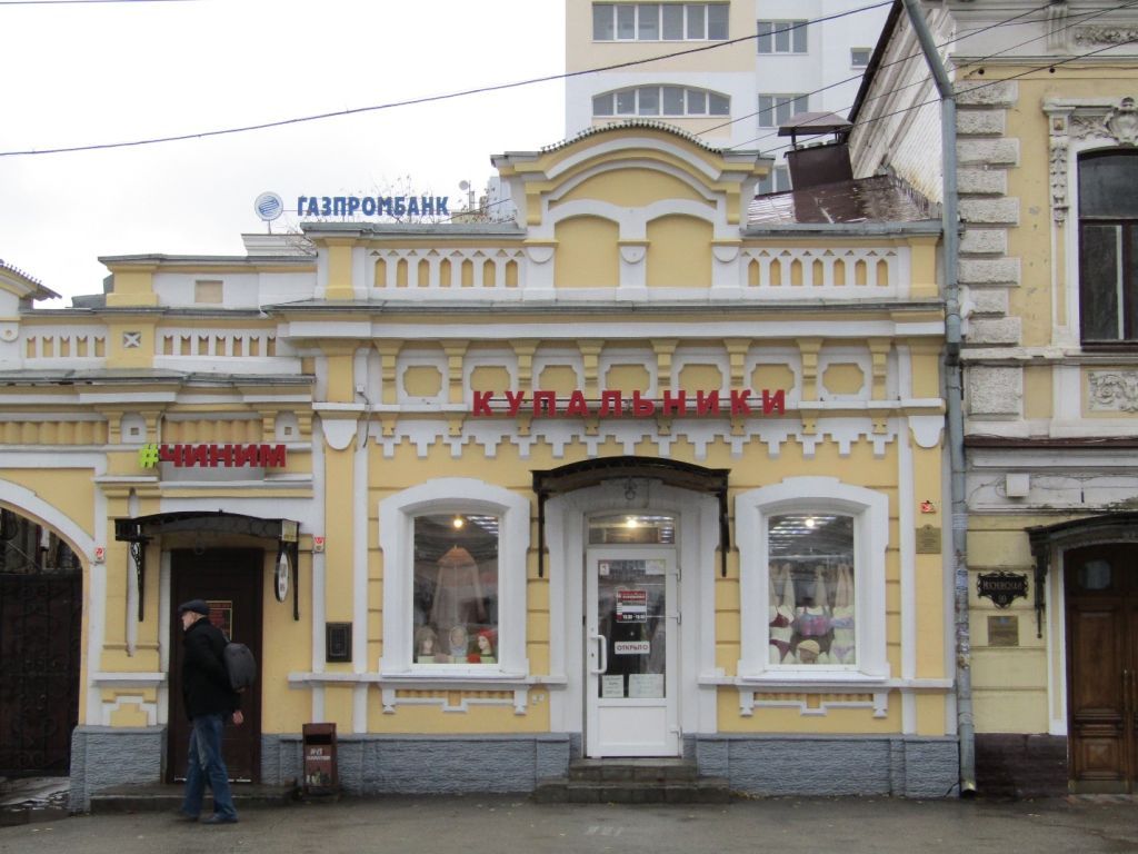 Флигель (лит. Е)5. Местоположение Объекта в структуре Ансамбля:•в северо- западном углу территории усадьбы. Жёлтым прямоугольником выделен исследуемый объект6. Габариты, объемно-пространственная композиция и силуэтные характеристики:•одноэтажное здание с подвалом;•форма в плане прямоугольная на период конца XIX века;•местоположение несущих стен;•кровля – скатная.7. Стилистическое решение, характер стен фасадов:•уличный фасад оштукатурен;•стилевое решение фасада (эклектика).План подвала 1948 План 1го этажа 1987 ул. МосковскаяКрасным выделены исторические капитальные стены8. Архитектурно-художественное оформление фасадов:8.1. Северо-восточный фасад [10]•на 3 световые оси;•фасад симметричен относительно центральной оси;•уровень цоколя;•местоположение и профиль подоконной тяги;•расшивка горизонтальным рустом в уровне первого этажа;•профиль и габариты городчатого пояса;•профиль и габариты венчающего карниза на кронштейнах;•рисунок филёнок в поле фриза венчающего карниза;•профиль и вынос венчающего карниза;•габариты трёхчастного аттика:-центральная часть выражена лучковым карнизом на кронштейнах,- боковые части представлены парапетными стенками с тумбами по краям;•профиль и рисунок кирпичного декора аттика;•профиль и габариты раскрепованных лопаток с кирпичным декором. Фото 109. Местоположение, габариты и декор световых осей:•габариты и конфигурация оконных проемов здания с лучковой перемычкой;•профиль и очертание наличников с подоконным декором. Фото 11